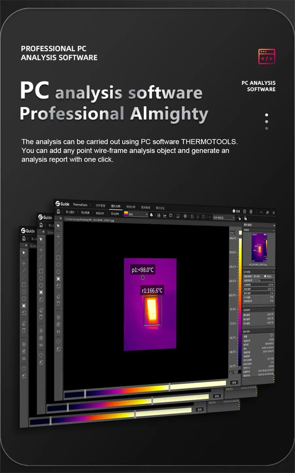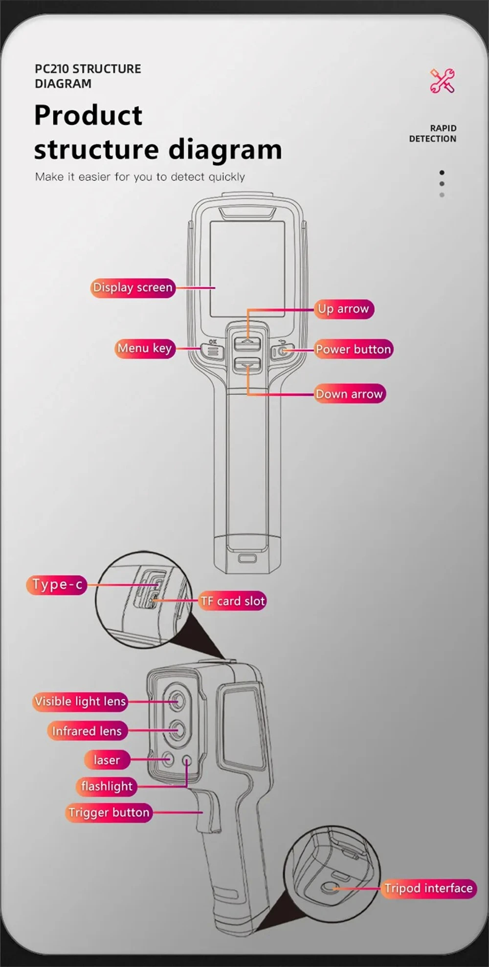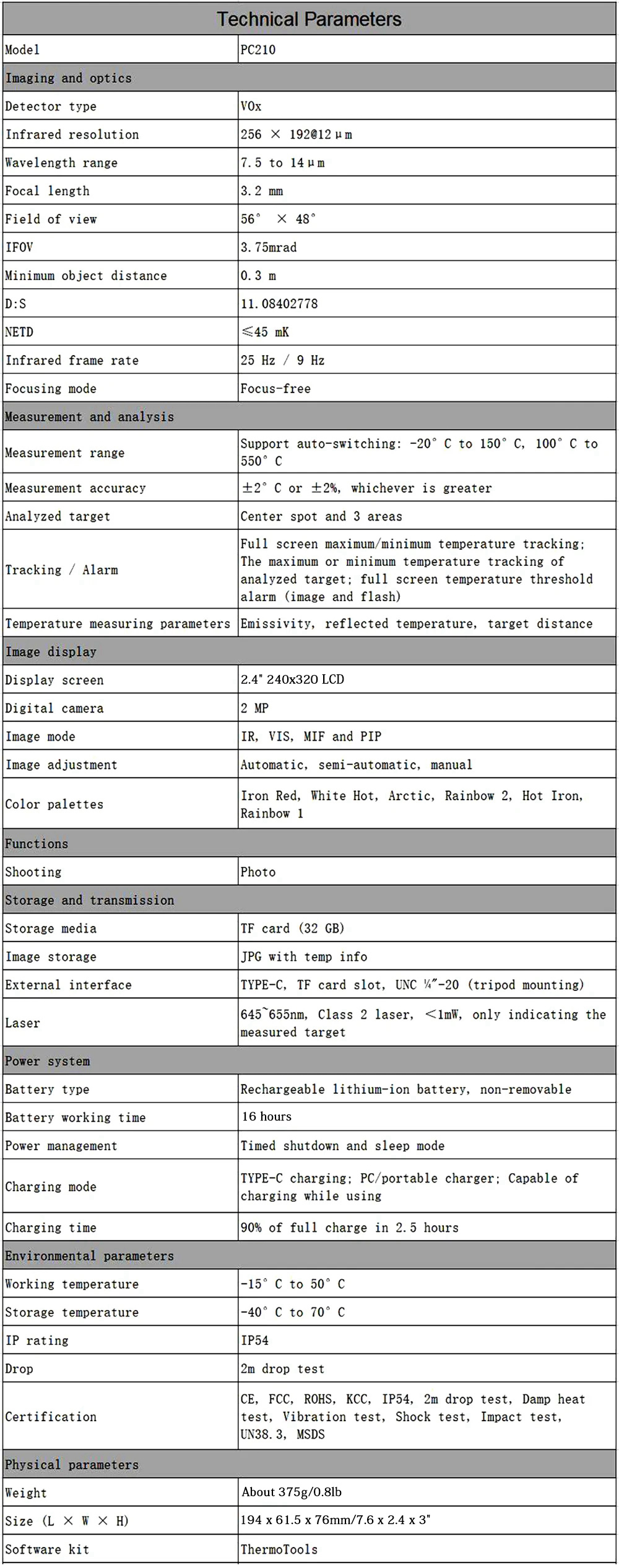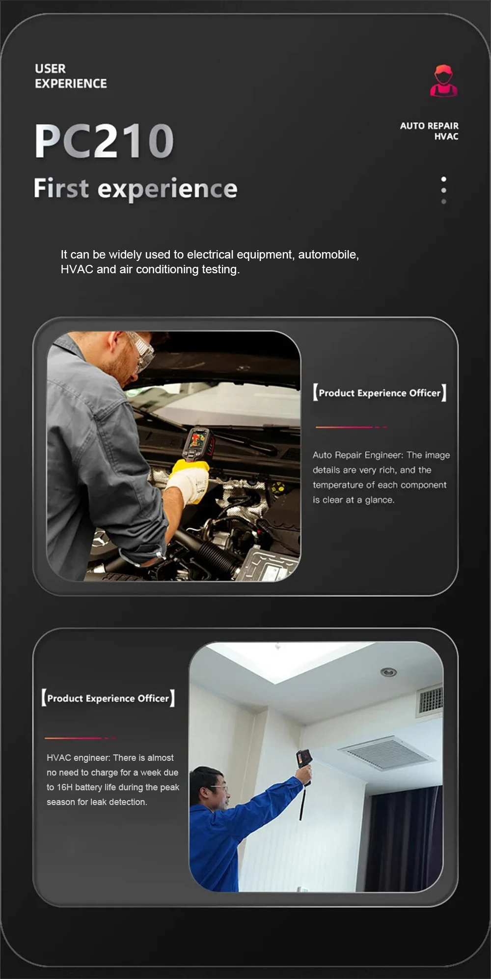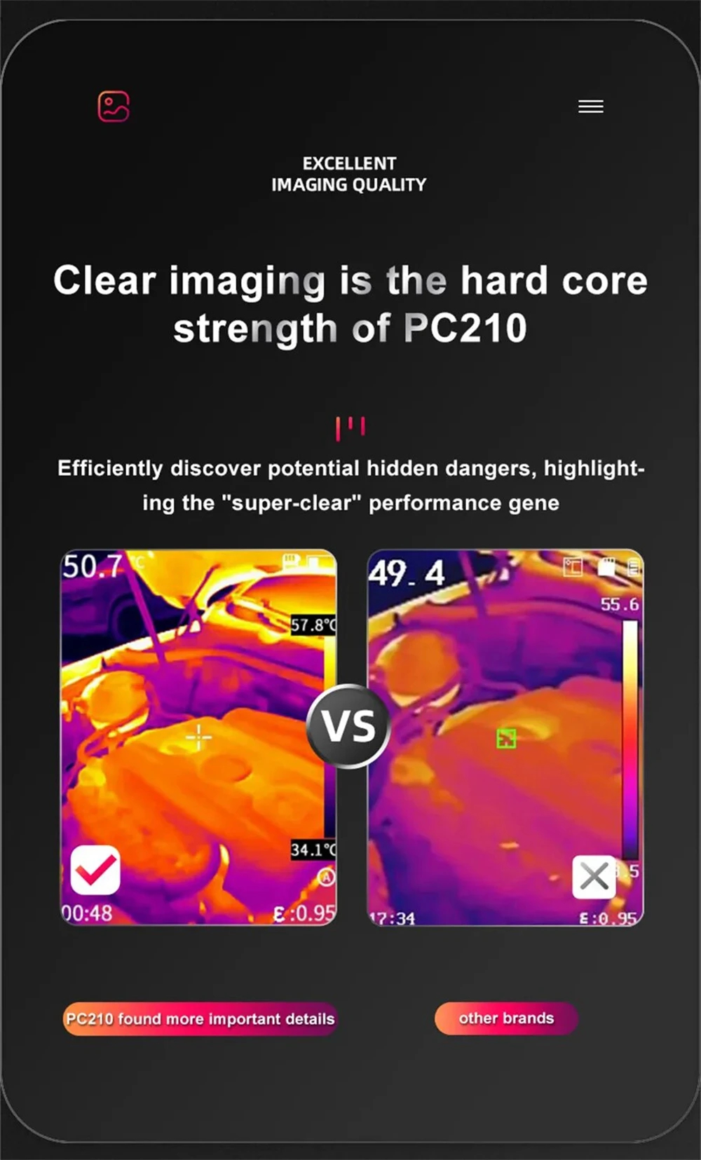 PC210, Tool-like Handheld Thermal Camera, is designed with excellent performance in image quality and charging battery life. This thermal camera adopts 256x192 IR detector and 2MP visible light. Adopts the New SharpIR composite image enhancement technology, it can provide you with detailed infrared thermal imaging and dual-light fusion images to help you find potential faults more quickly.