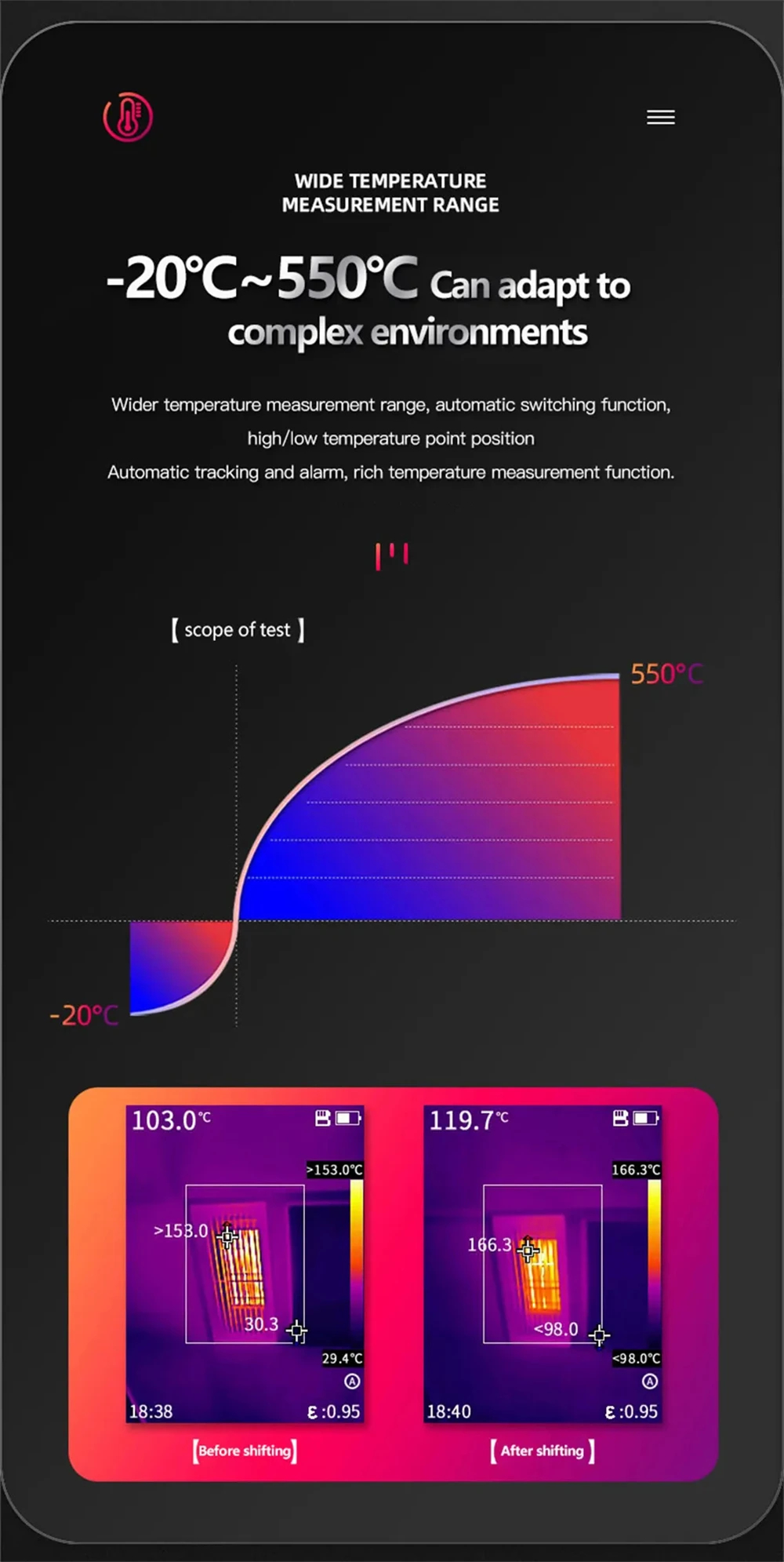 - Wide temperature measurement range: Automatic switching of -20°C to 150°C and 100°C to 550°C