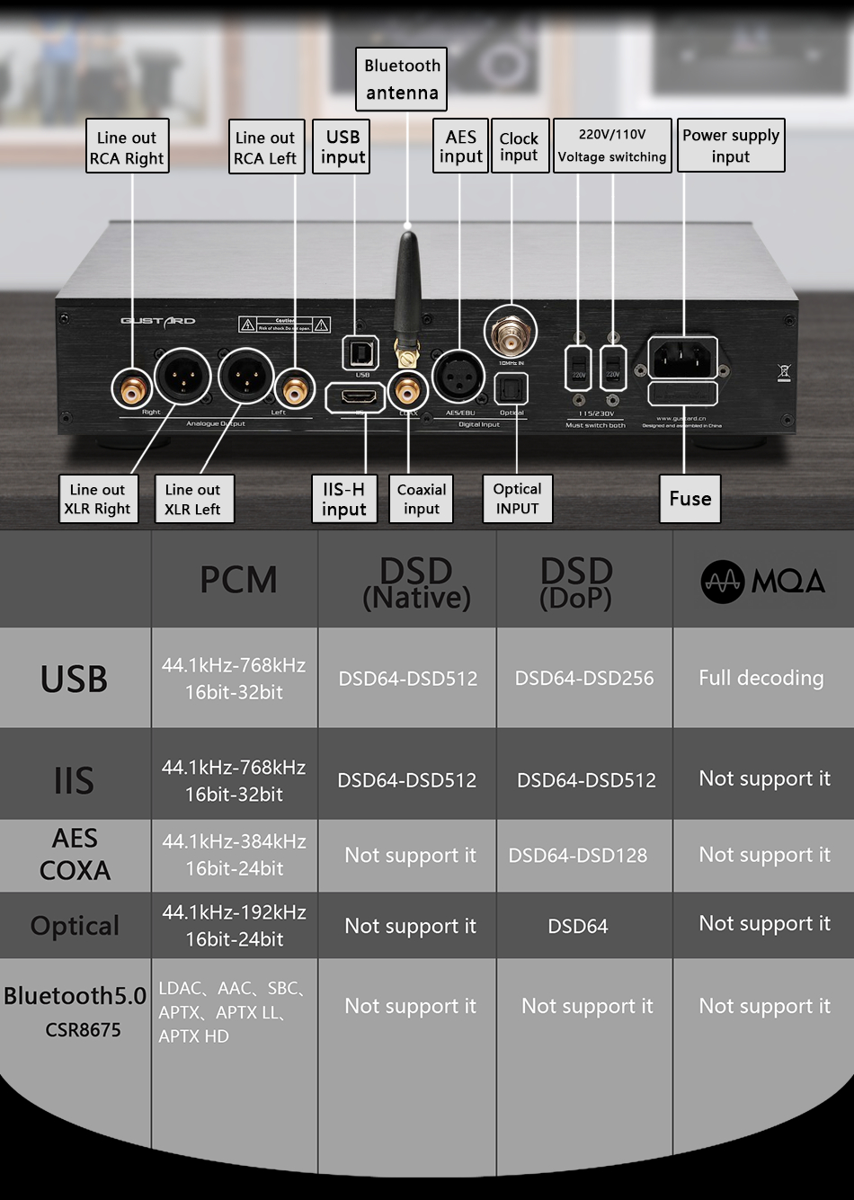 - Digital filtering: 3 kinds of PCM, 4 kinds of DSD, support for NOS mode