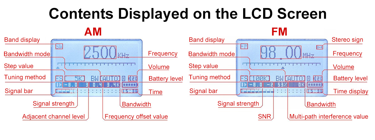 - FM: 76-108MHz; Steps: 10K, 50K, and 100K (100K is the default)