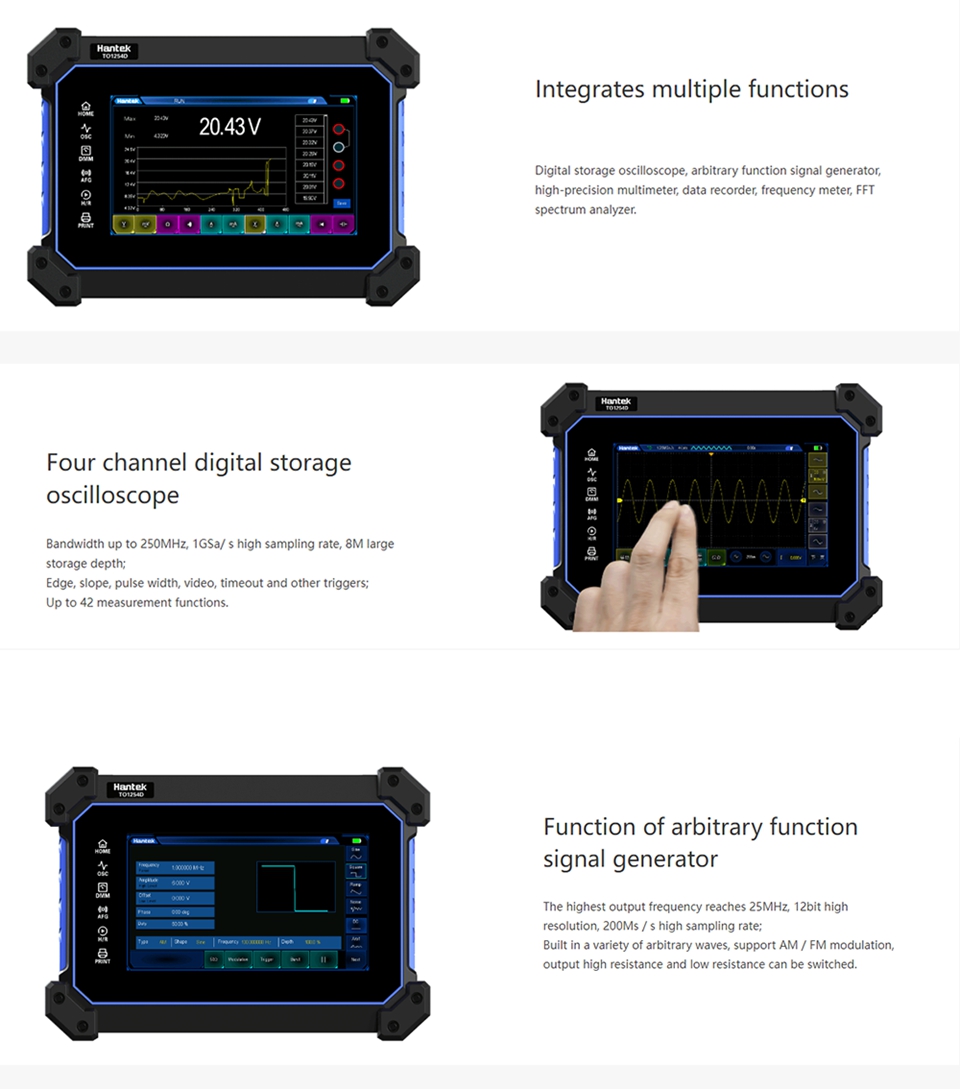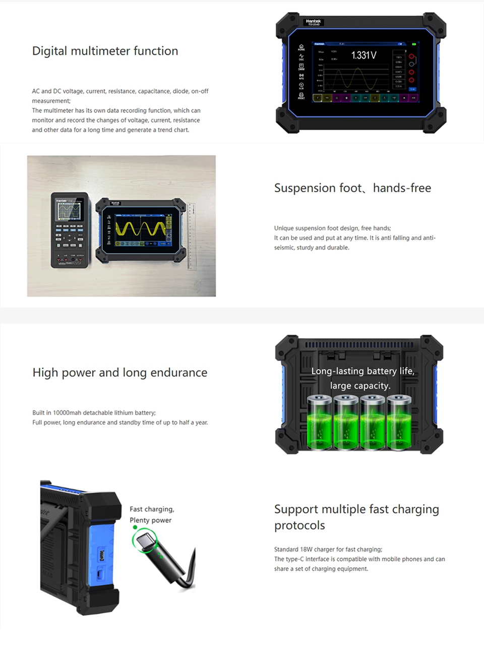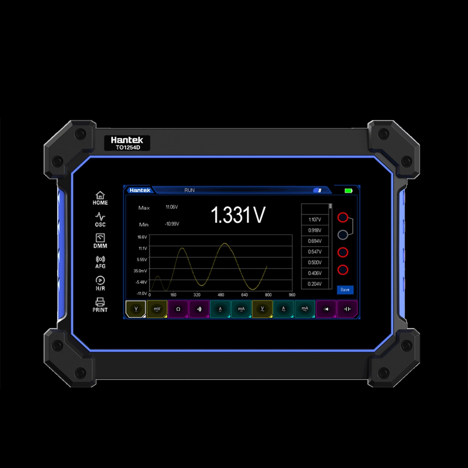 - The new generation of TO1000 series multi-functional full touch screen oscilloscope has a thin body, light weight and is easy to carry; Unique hanging design, hands-free, anti falling and anti-seismic, sturdy and durable; It integrates oscilloscope, multimeter, signal generator and spectrum analyzer; Built in super large capacity battery, long endurance, support fast charging, and abundant power.
