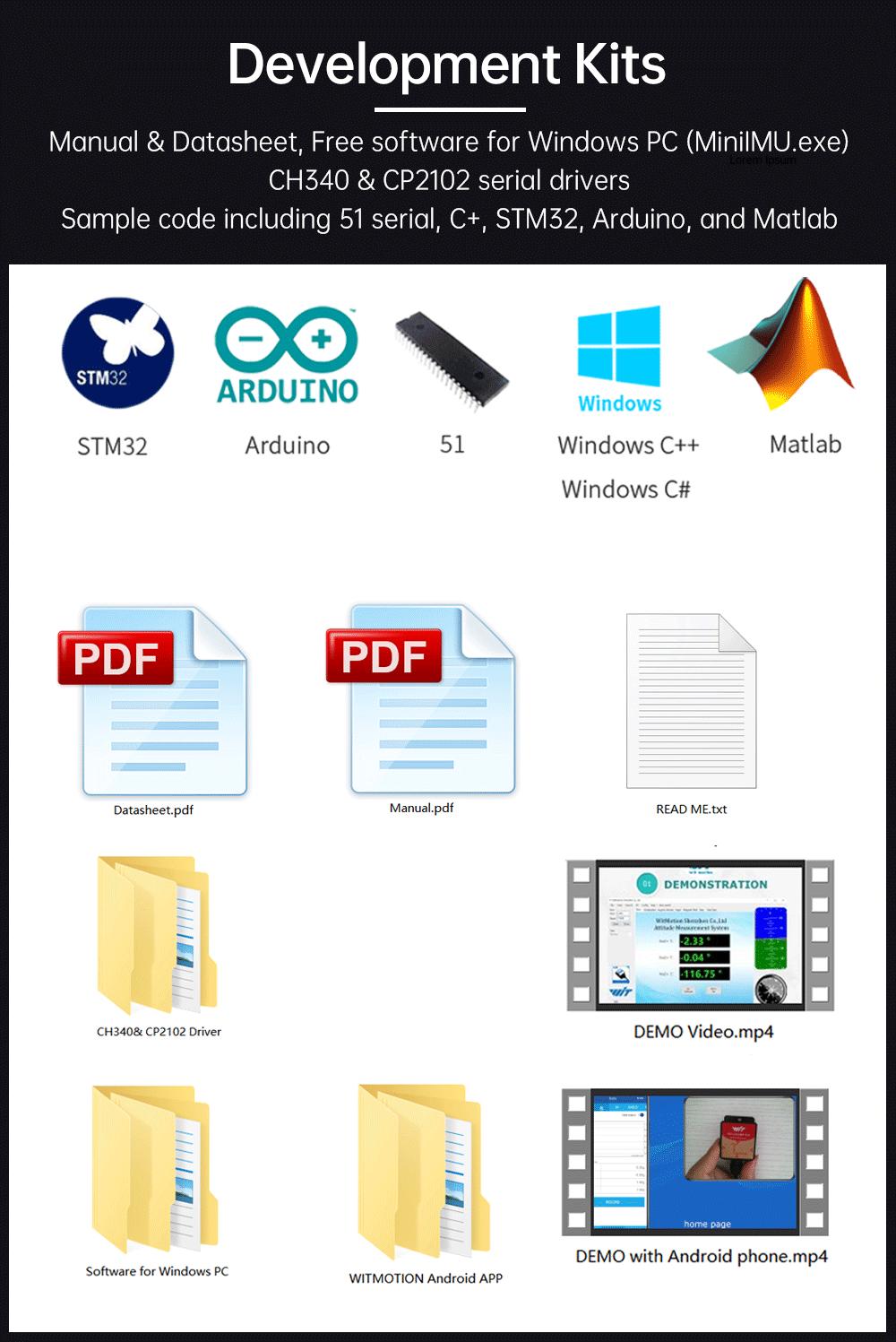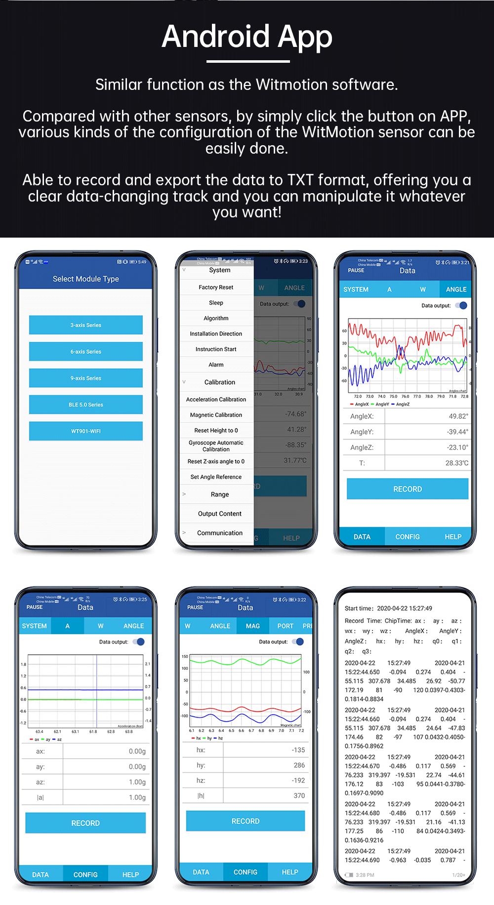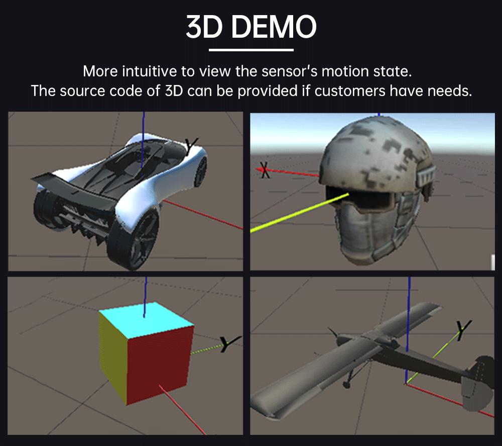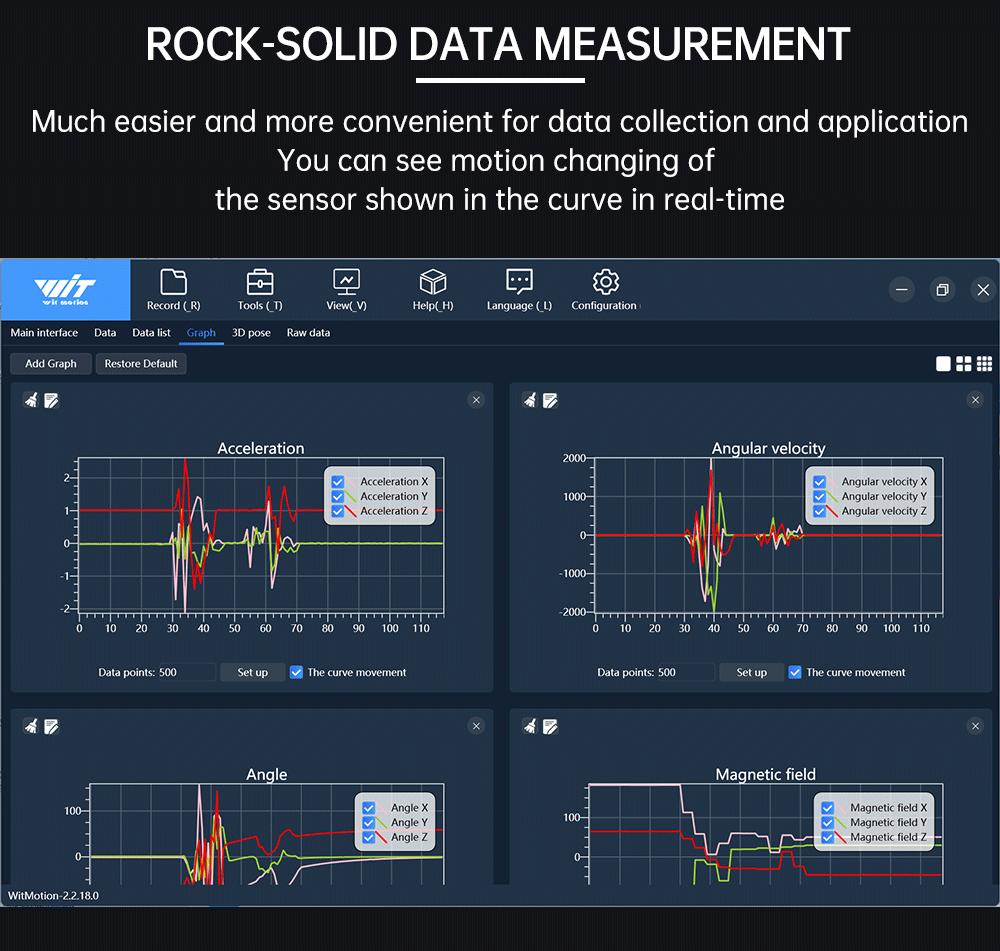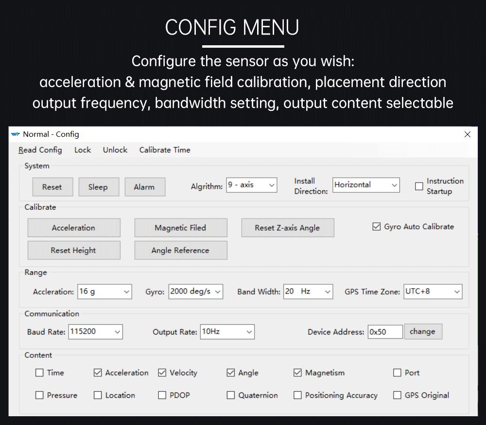 - Output data: 3-axis (acceleration, gyroscope, angle, magnetic field)