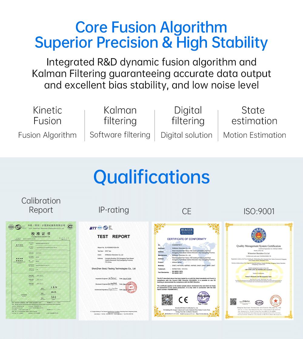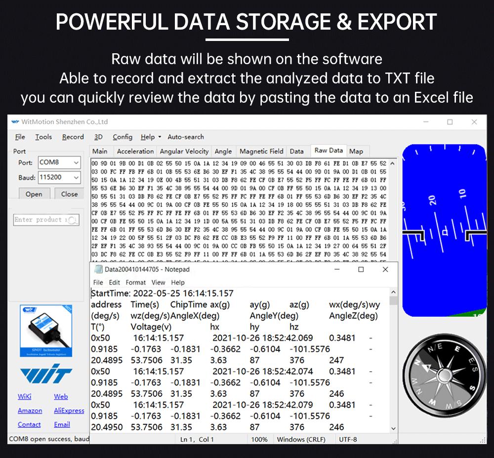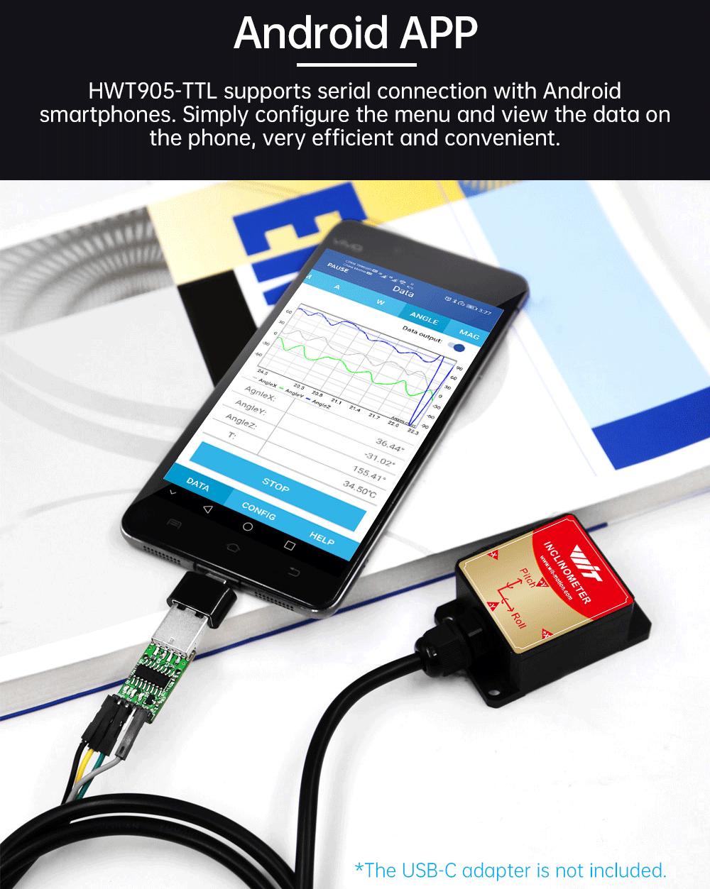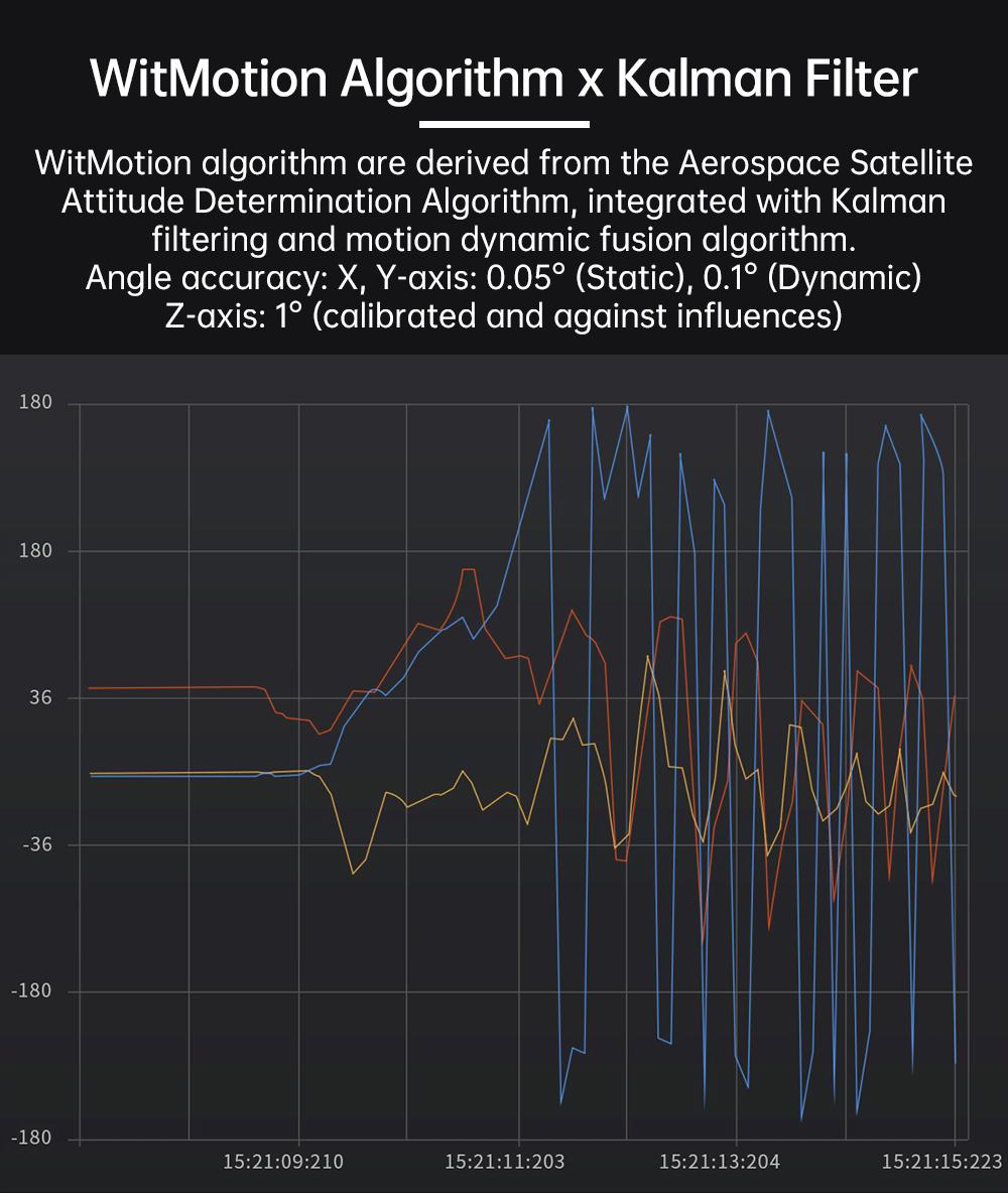 - Output data: 3-axis (acceleration, gyroscope, angle, magnetic field)