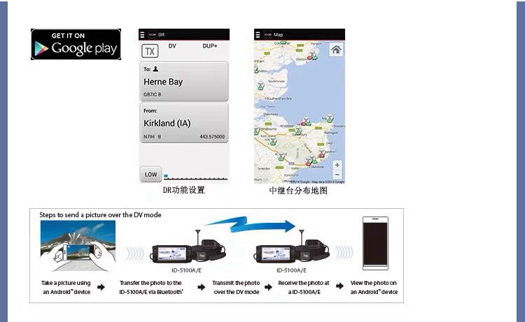 - RS-MS1A Android application software (Google play free download) Android device is wirelessly connected with ID-5100A through RS-MS1A software, to control and set DR function in DV mode, connect to map application and send/receive information, transfer pictures.
