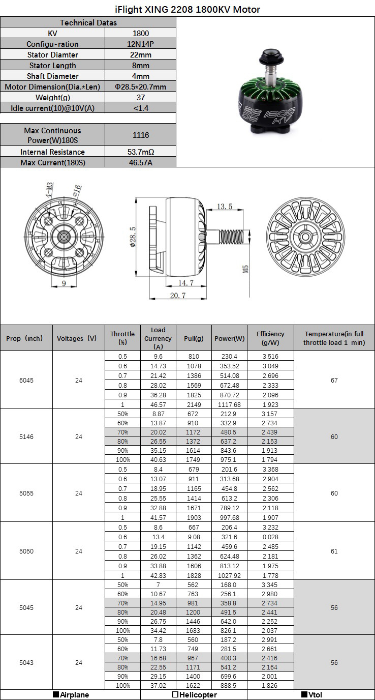 There's non-slip design on the contact surface of iFlight XING motor and propellers to increase the friction and to improve durability; Multi-heat dissipation hole design, helps to pull heat away continuously; Standard M3 16mm*16mm mounting pattern at the bottom, adapt to all frames on market; Motor cable length 160mm can meet different requirements whether connecting single or 4 in 1 ESC; Each motor has been dynamic balanced, all of them have passed the highest standard iFlight manufacturing and assembling procedure.
