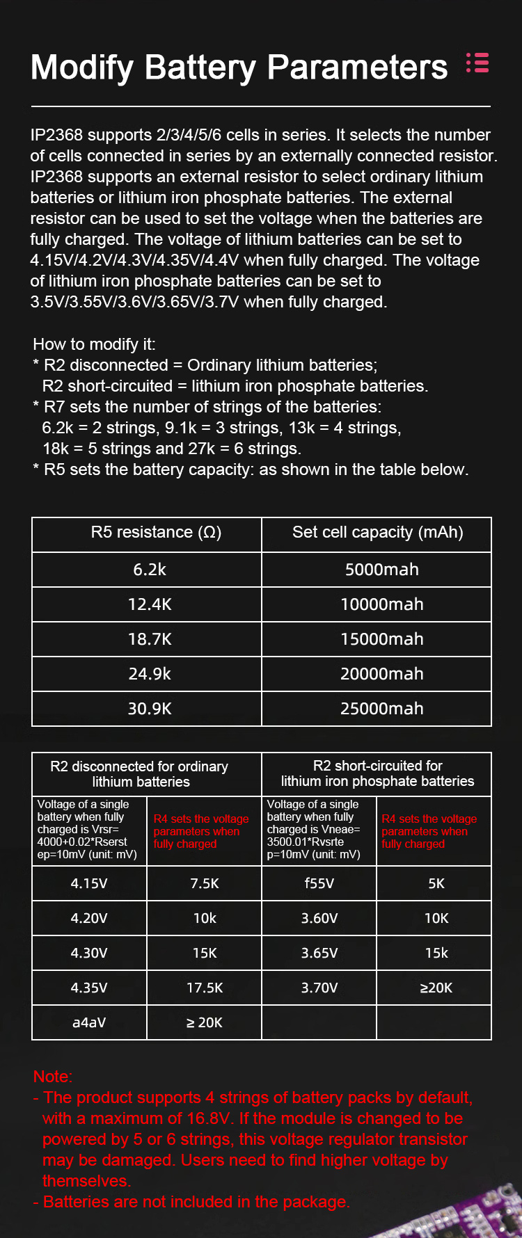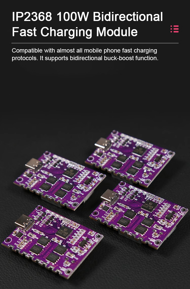 - IP2368 100W bidirectional fast charging module: It is compatible with almost all mobile phone fast charging protocols. Modify resistor to support other batteries. It supports bidirectional buck-boost function.