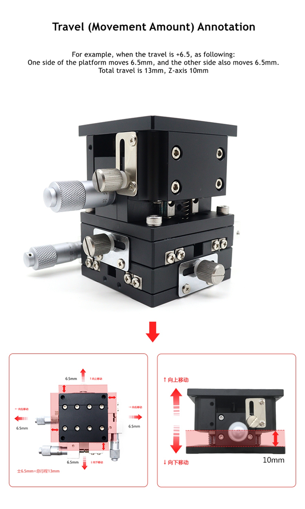 - Travel: ±6.5mm for XY axis; 10mm for Z axis