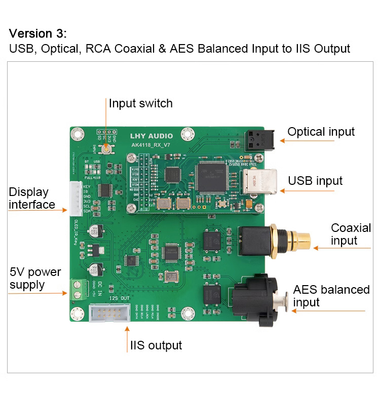 The main function of this board is to convert digital audio SPDIF signal (RCA/optical/AES/EBU/Bluetooth) to IIS output. Used with a suitable DAC board, it can form a complete DAC decoder.