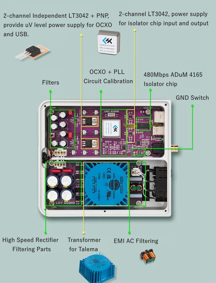 - Using up to 4 uV level low noise pure linear power supplies to independently power the OCXO constant temperature crystal oscillator, isolation chip, and USB output port, completely isolating power interference from the PC.