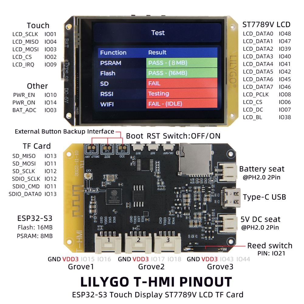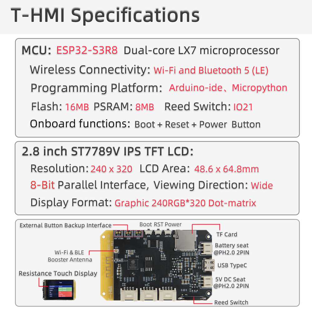 - T-HMI is currently LILYGO's largest touch display screen equipped with ESP32-S3 chip. The screen uses a 2.8-inch ST7789 LCD and is equipped with a resistive screen stylus/pen; supports TF card, WIFI and Bluetooth 5.0; onboard Flash: 16MB , PSRAM: 8MB, Type C USB interface, 5V DC seat.