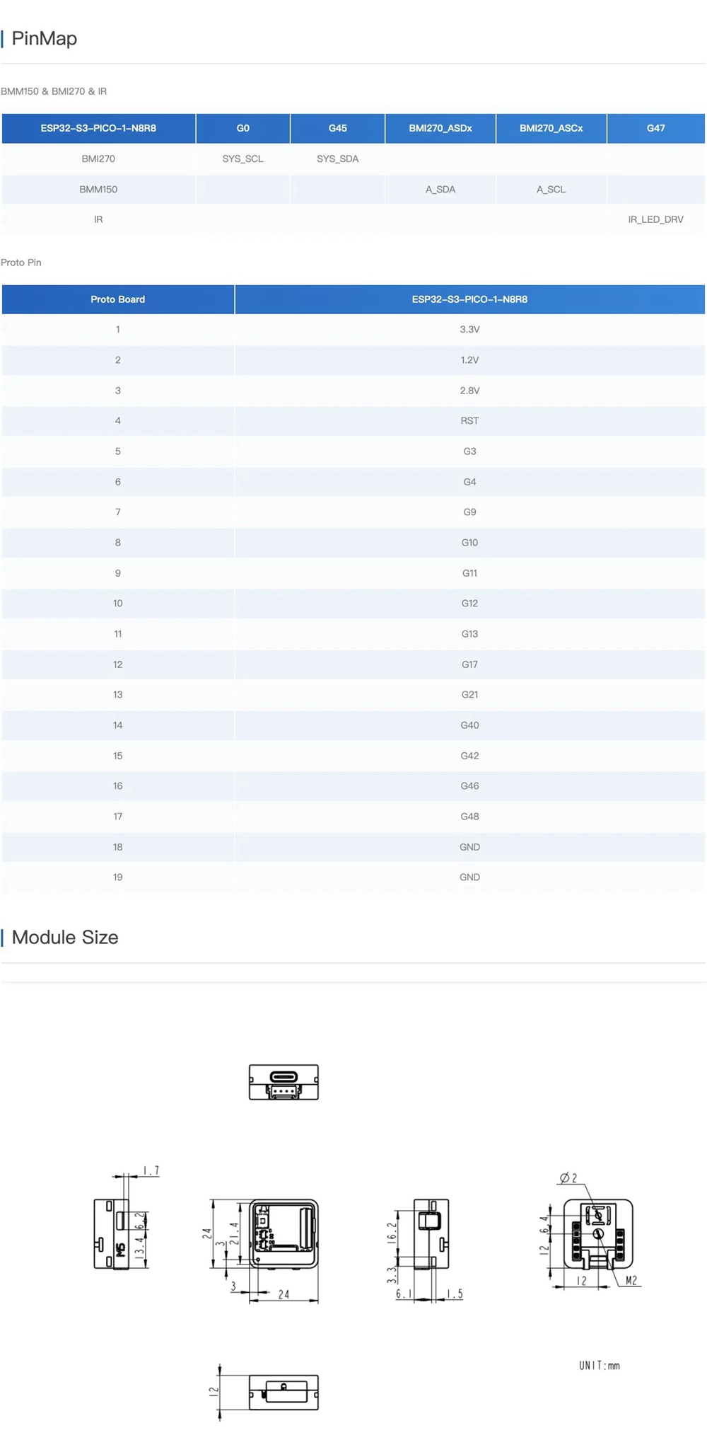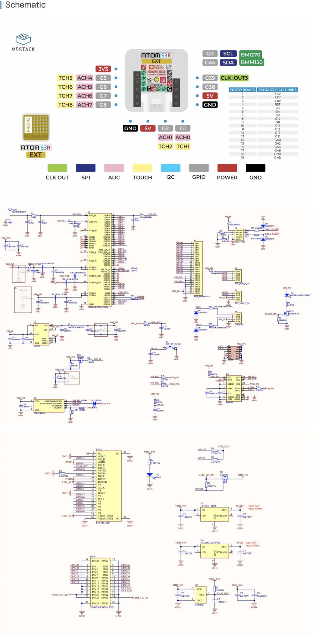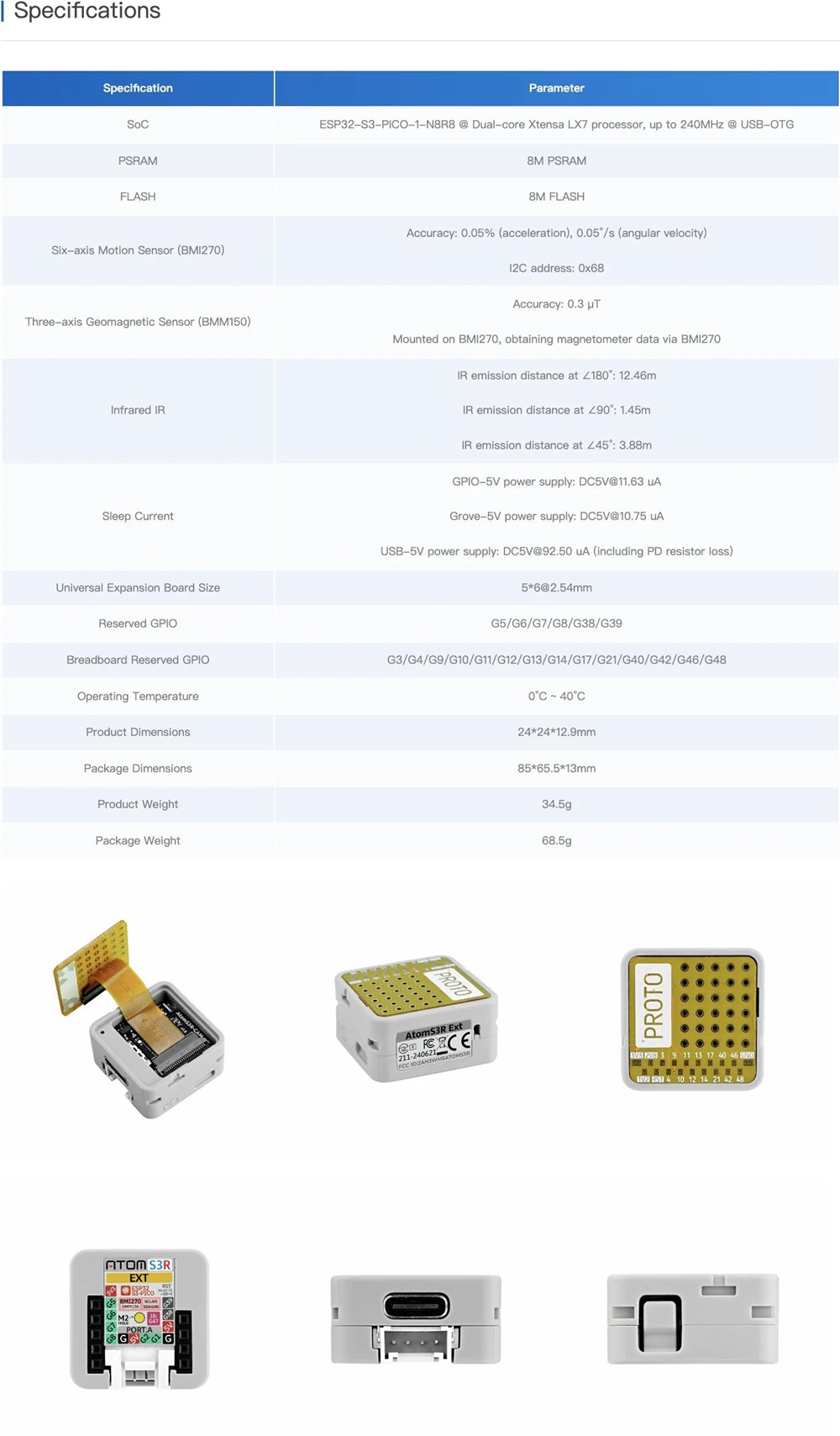 - AtomS3R Ext is a prototype development expansion programmable controller based on the ESP32-S3 main controller, designed specifically for prototype validation and expansion development. It features a prototype breadboard on top, allowing users to connect and debug multiple IO ports, making it suitable for various peripheral module expansions and function validation. The device integrates the ESP32-S3-PICO-1-N8R8 main controller, supports WiFi functionality, and includes 8MB onboard FLASH and 8MB PSRAM, along with a power circuit that converts 5V to 3.3V/2.8V/1.2V. It also has a built-in three-axis BMM150 geomagnetic sensor and a six-axis BMI270 motion sensor. The controller is equipped with a Type-C interface for power supply and firmware downloads, as well as an HY2.0-4P expansion port, six GPIO, and power pins for easy functionality expansion. Compared to previous ATOM series host products, the AtomS3R Ext features an enhanced 3D antenna, providing better signal performance and stability. Measuring only 24x24x12mm, it is highly suitable for prototype development and validation applications in embedded smart devices.
