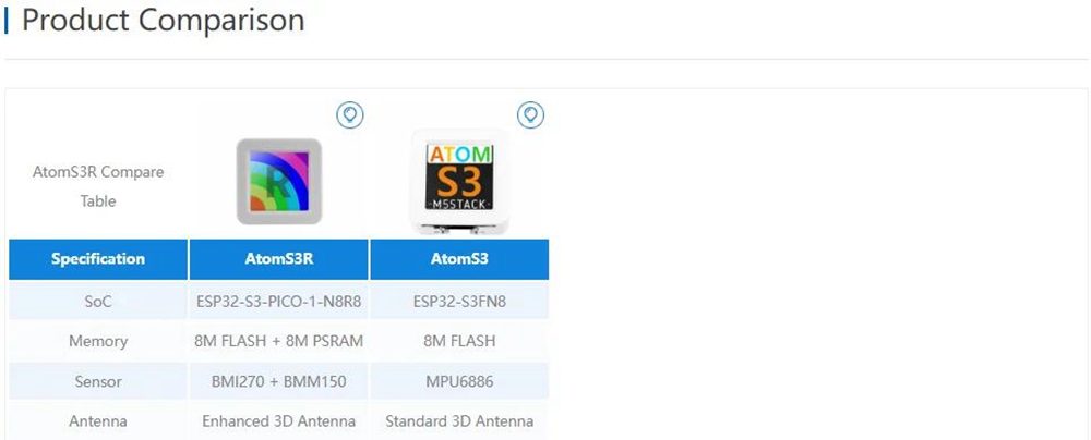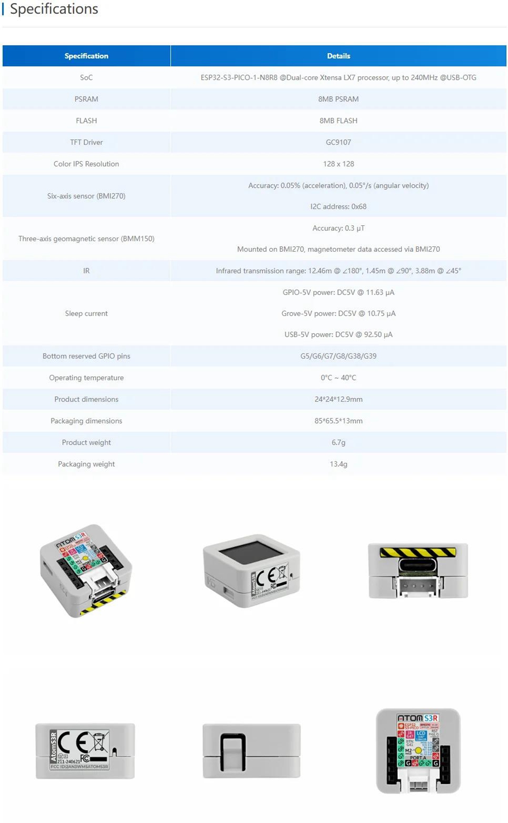 - AtomS3R is a highly integrated programmable controller based on the ESP32-S3 main controller. It features the ESP32-S3-PICO-1-N8R8 main controller with built-in WiFi, 8MB onboard FLASH, and 8MB PSRAM. It comes with a 0.85-inch color IPS screen, with a programmable button beneath the screen. The device includes a 5V to 3.3V power circuit, a built-in three-axis BMM150 geomagnetic sensor, and a six-axis BMI270 attitude sensor. It also has a Type-C interface for power supply and firmware downloads, along with a HY2.0-4P expansion port. Six GPIO and power pins are reserved at the bottom for easy expansion. Compared to previous products, the 3D antenna of the AtomS3R has been enhanced, offering better performance and greater stability. The product measures only 24x24x12.9mm, making it suitable for various embedded smart device applications.