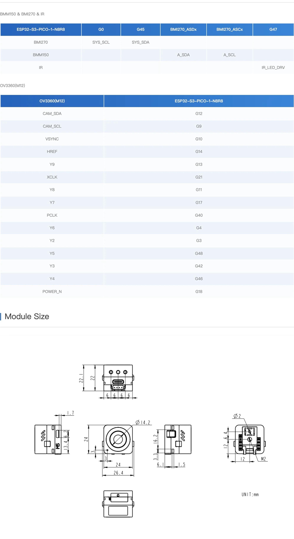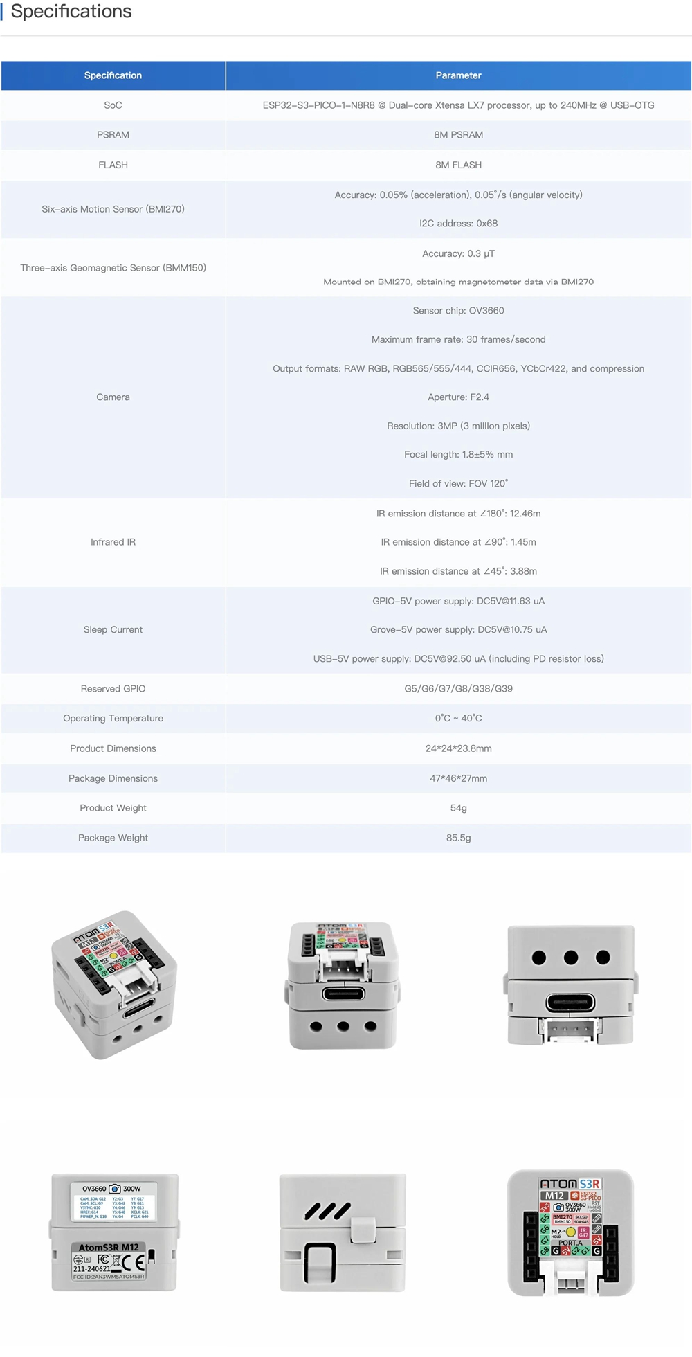 - AtomS3R M12 is an IoT programmable controller integrated with an M12 camera, featuring a 3-megapixel OV3660 camera that supports high-resolution image acquisition. It uses the ESP32-S3-PICO-1-N8R8 as the main controller, with built-in WiFi functionality, 8MB onboard FLASH, and 8MB PSRAM. It includes a power management circuit that converts 5V to 3.3V and has an embedded three-axis BMM150 geomagnetic sensor and a six-axis BMI270 motion sensor. The product comes with UVC (USB Video Class) firmware, allowing it to be used as a plug-and-play USB camera without the need for driver installation, and it also has infrared emission control.