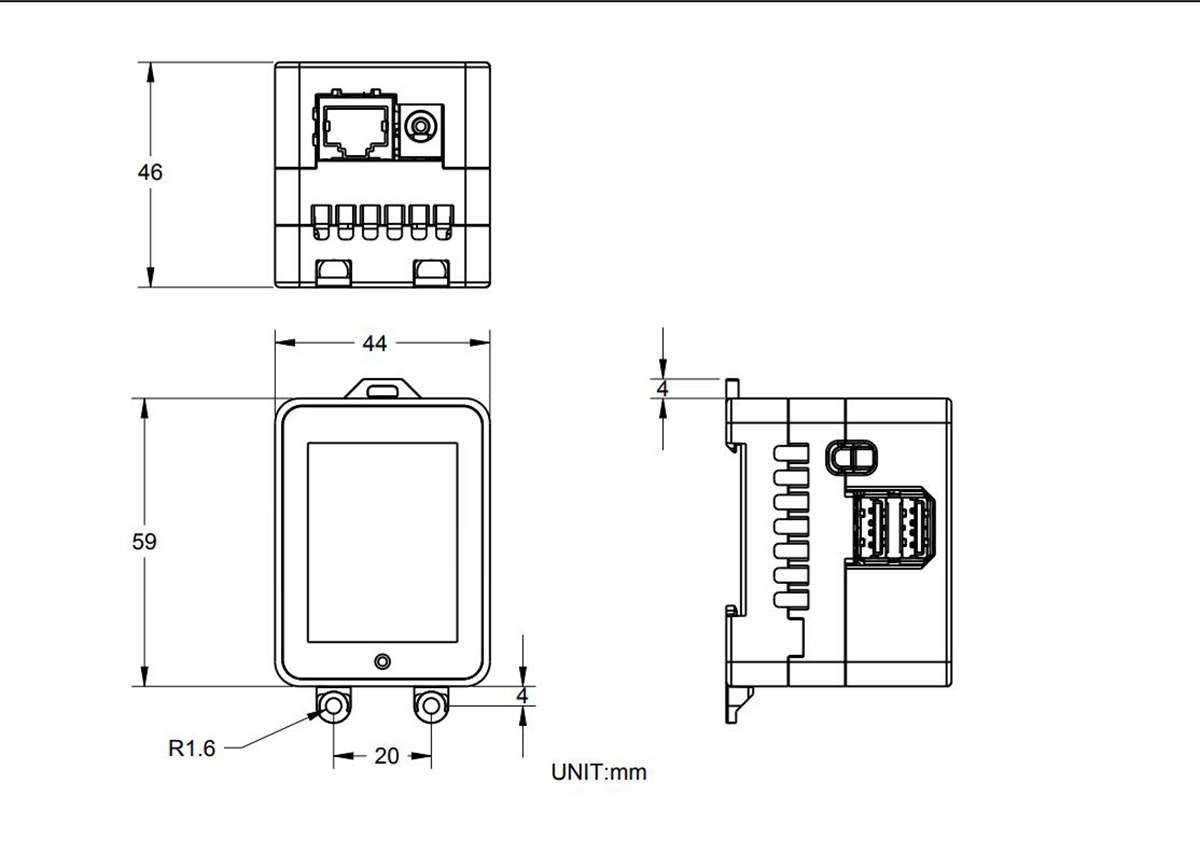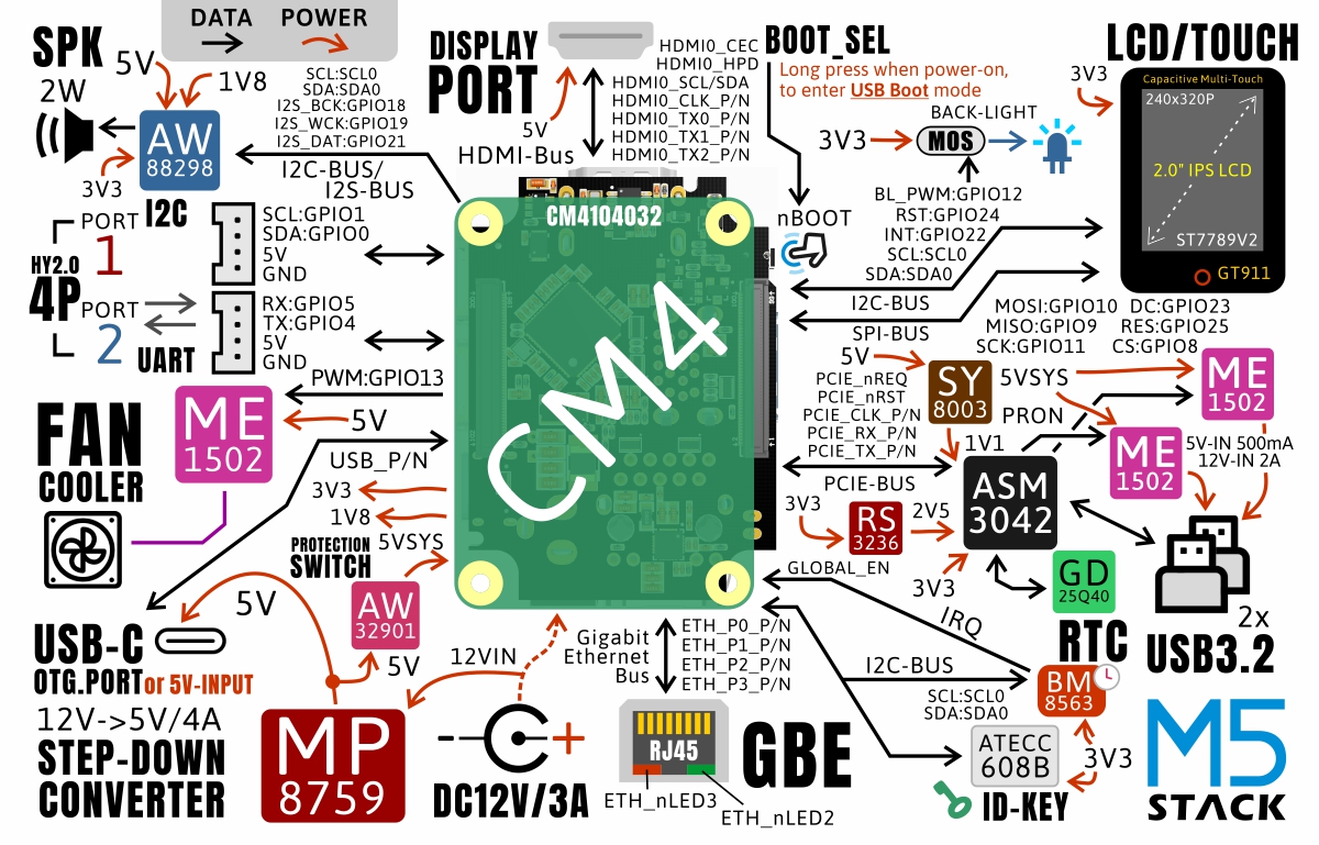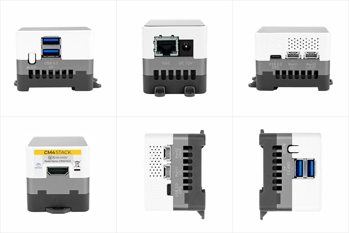 - CM4STACK features a vivid 2.0-inch IPS-LCD screen with capacitive touch, offering a crisp resolution of 320x240. It also provides convenient connectivity options, including two USB3.2-A ports (pcie + ASM3042) and a versatile USB-C (2.0) interface that supports OTG and power delivery. HDMI, Gigabit Ethernet RJ45, and DC-JACK 12V at 3A are also provided for seamless integration.