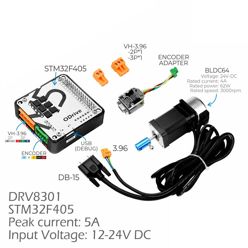 - ODrive is a high-performance servo motor drive module launched by M5Stack, based on the open source motion control solution ODrive. Supports the control of a single three-phase servo motor, the peak drive current can reach 5A. It has high-speed motor control capability while providing encoder signal interface, which can realize high-precision motion control positioning. The module uses UART communication interface and is compatible with the official ODrive configuration tool and protocol (you can also configure different motor motion modes through the host computer tool to make the motor work more smoothly and stably).