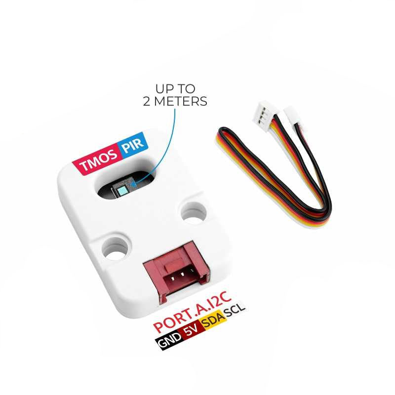 - TMOS PIR Unit is a high-sensitivity infrared sensor unit for presence and motion detection. It uses the STHS34PF80 chip solution. It communicates with M5 devices through I2C (default address: 0x5A). Its working principle is based on the black-body radiation principle described by Planck's law, which allows it to monitor ambient temperature and detect human presence and motion. The sensor can distinguish between stationary and moving objects and has an 80-degree field of view, providing a wide detection range. Additionally, it supports adjustable sampling frequency and gain modes to meet different application needs. It is suitable for applications such as alarm systems, smart lighting, and occupancy detection.