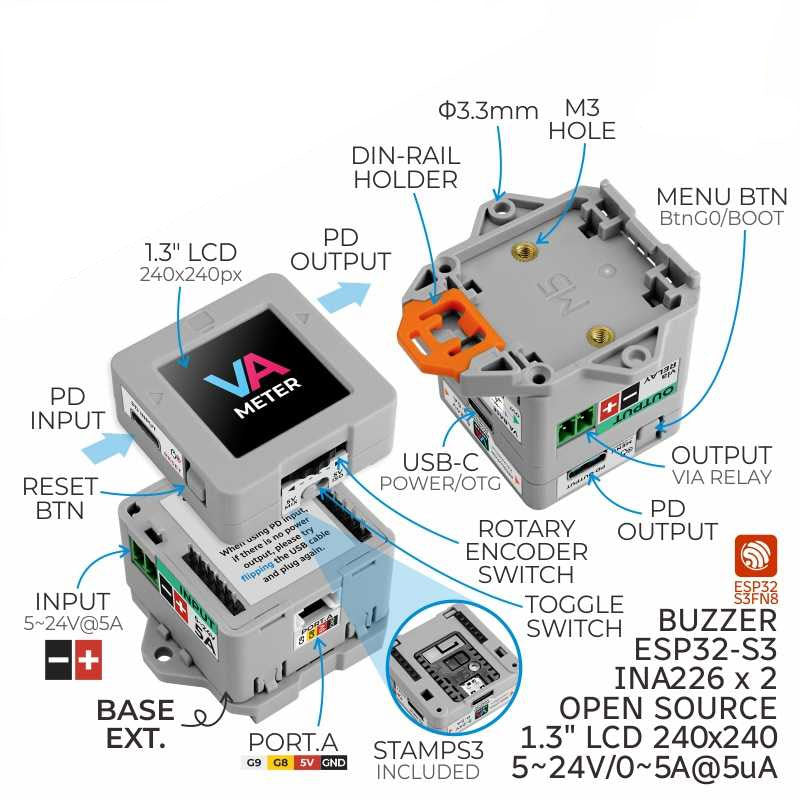 M5Stack VA Meter Programmable High Precision Power Meter M5StampS3 Voltage Current Measurement