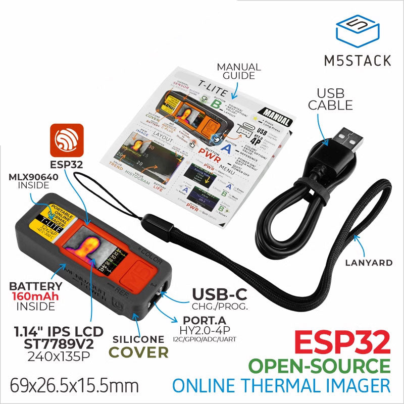- T-Lite is an integrated thermal imaging acquisition temperature measurement device with online detection function, the product is mainly composed of M5StickC-PLUS and UNIT THERMAL, using MLX90640-BAA infrared imaging sensor, the main control uses ESP32-PICO-D4 chip, with WIFI function, 135*240 resolution TFT screen, built-in 160mAh battery, its "T-Lite" The T in the name stands for temperature, and Lite stands for small, highly integrated. Users can set the high temperature warning function, and view temperature images and data in real time through the cloud and LAN. M5 also provides an online data API interface, which can obtain remote images and corresponding data through EZData, which is convenient for engineering project applications.