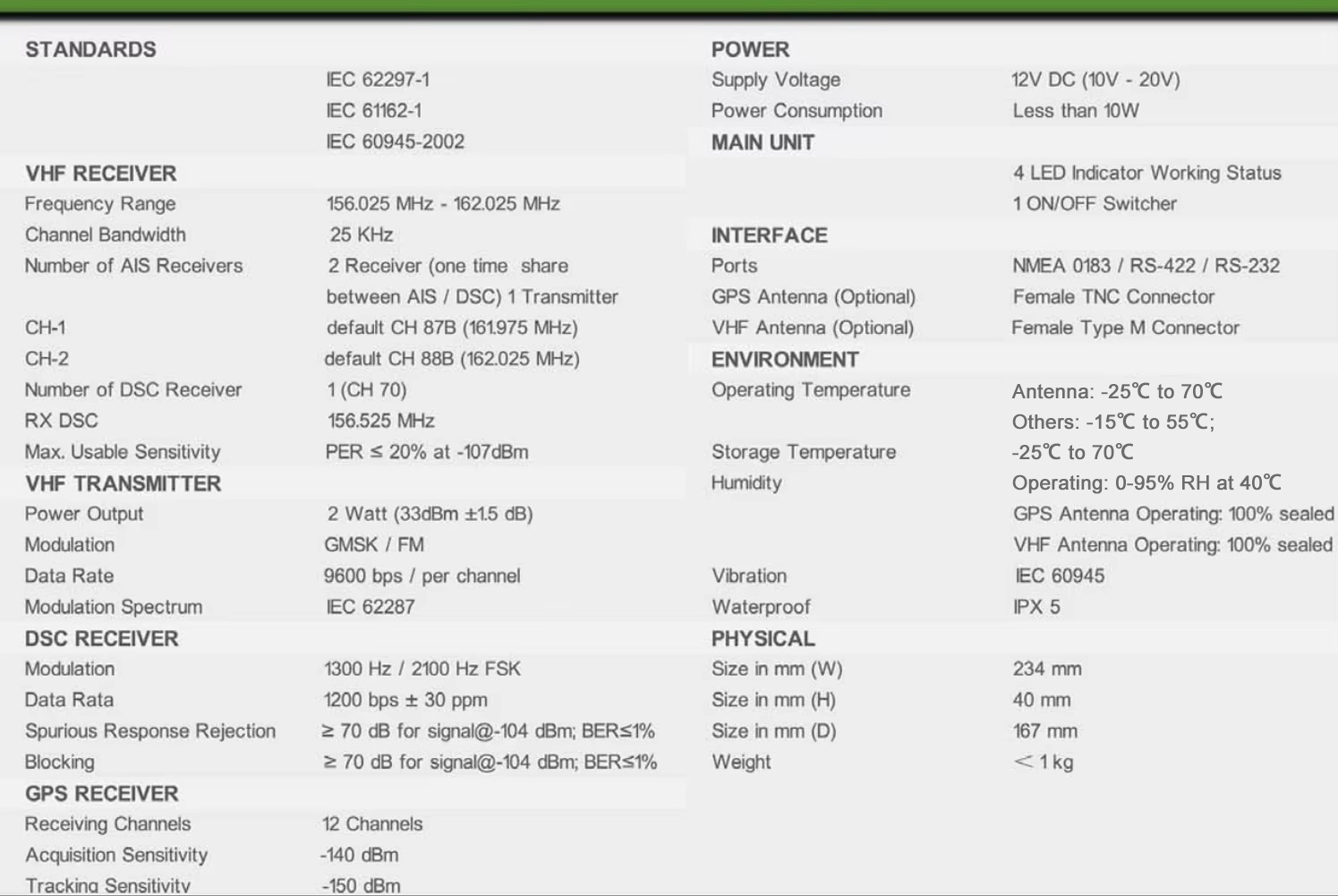- Internal GPS receiver, as data source for position, COG and SOG can be connected to all devices compatible with GPS and PC, PDA, ECDIS, RADAR, etc.