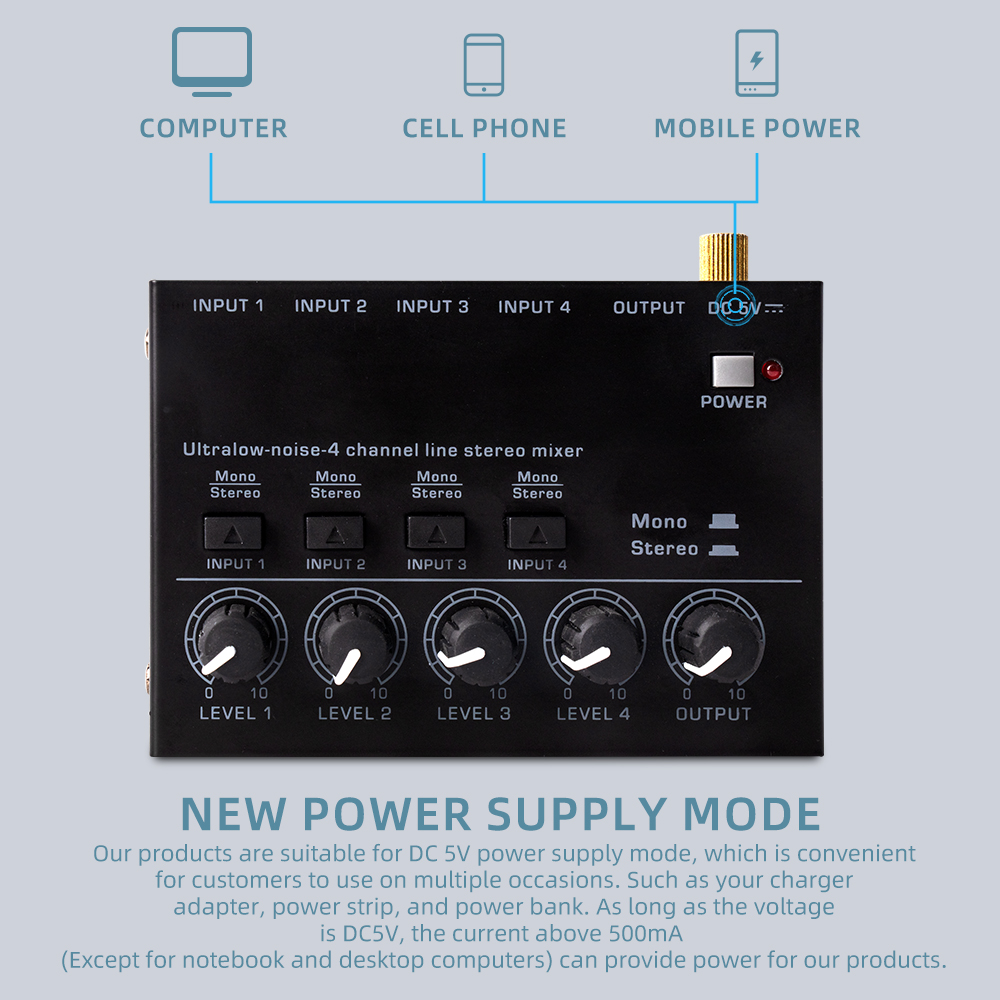 - The digital mixer uses the latest DC 5V power supply mode, so it no longer restricts the application scenarios.