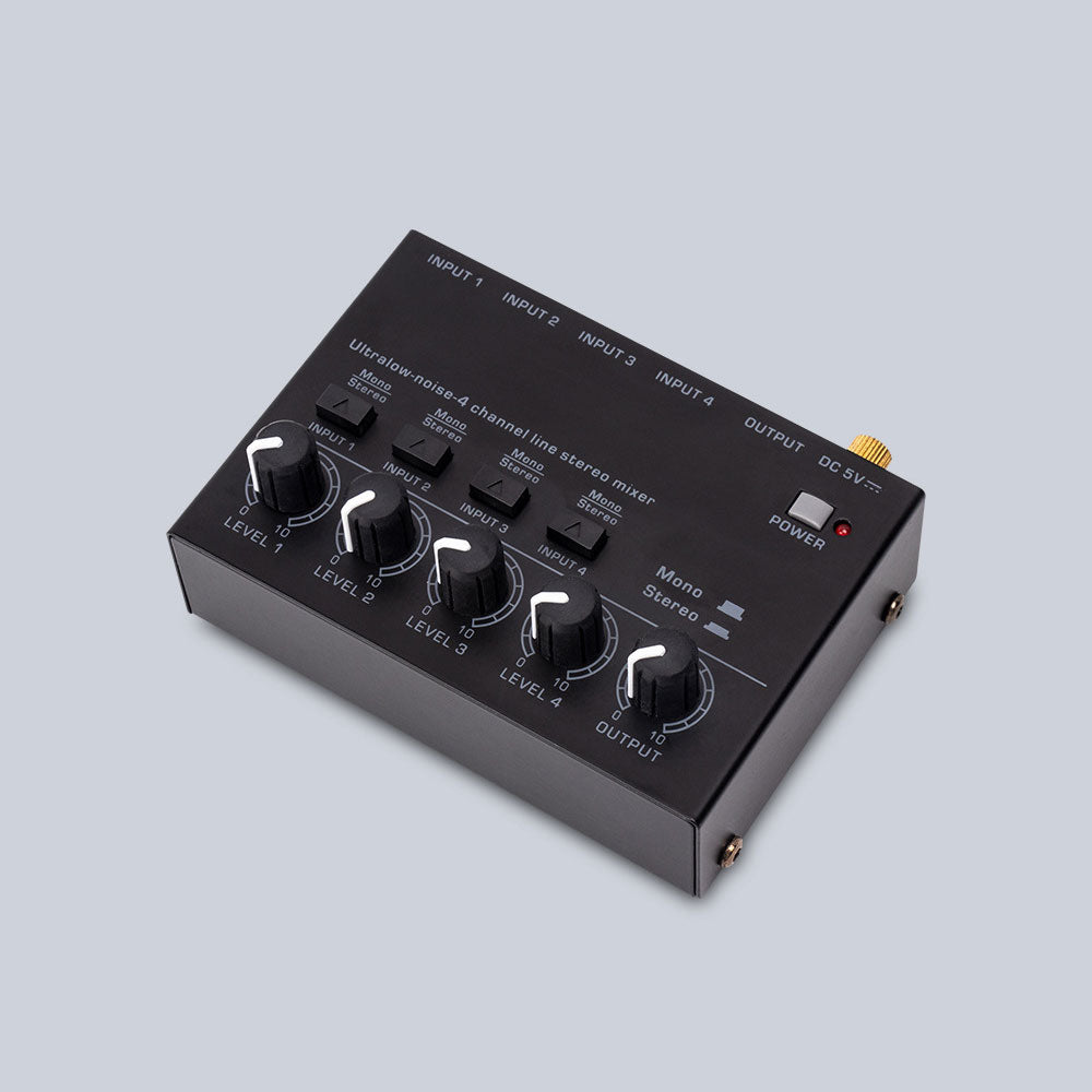 - Mini audio mixer produces the highest sound quality at all output levels, has ultra-low noise operability, and provides excellent audio performance. Distortion-free and easy to set up, ideal for quickly mixing 4 line-level signals without complexity. The 4-channel mixer produces the highest signal quality with the highest signal integrity, even at the highest levels. It is ideal for multi-keyboard devices and recording.