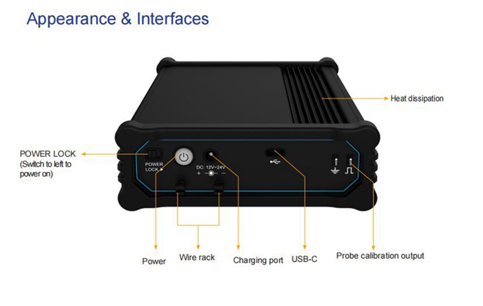 - Probe calibration signal: 1kHz, 2Vpk-pk