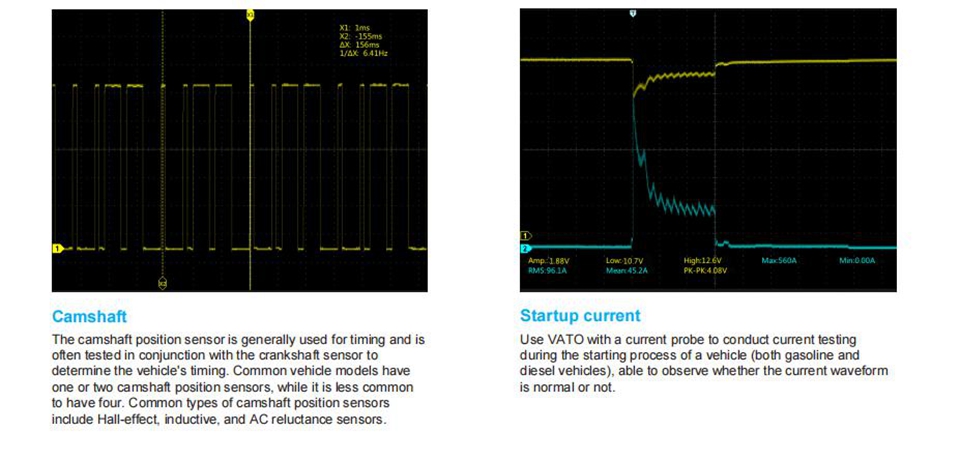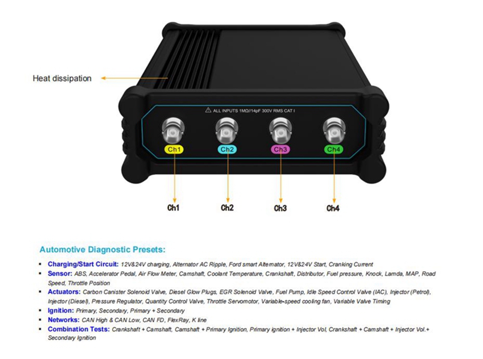 - VATO2004 is a portable affordable split-type automotive diagnostic oscilloscope, most compact design with a built-in battery. It features 200MHz bandwidth, 4 channels, 1GSa/s sampling rate, up to 50Mpts memory depth.