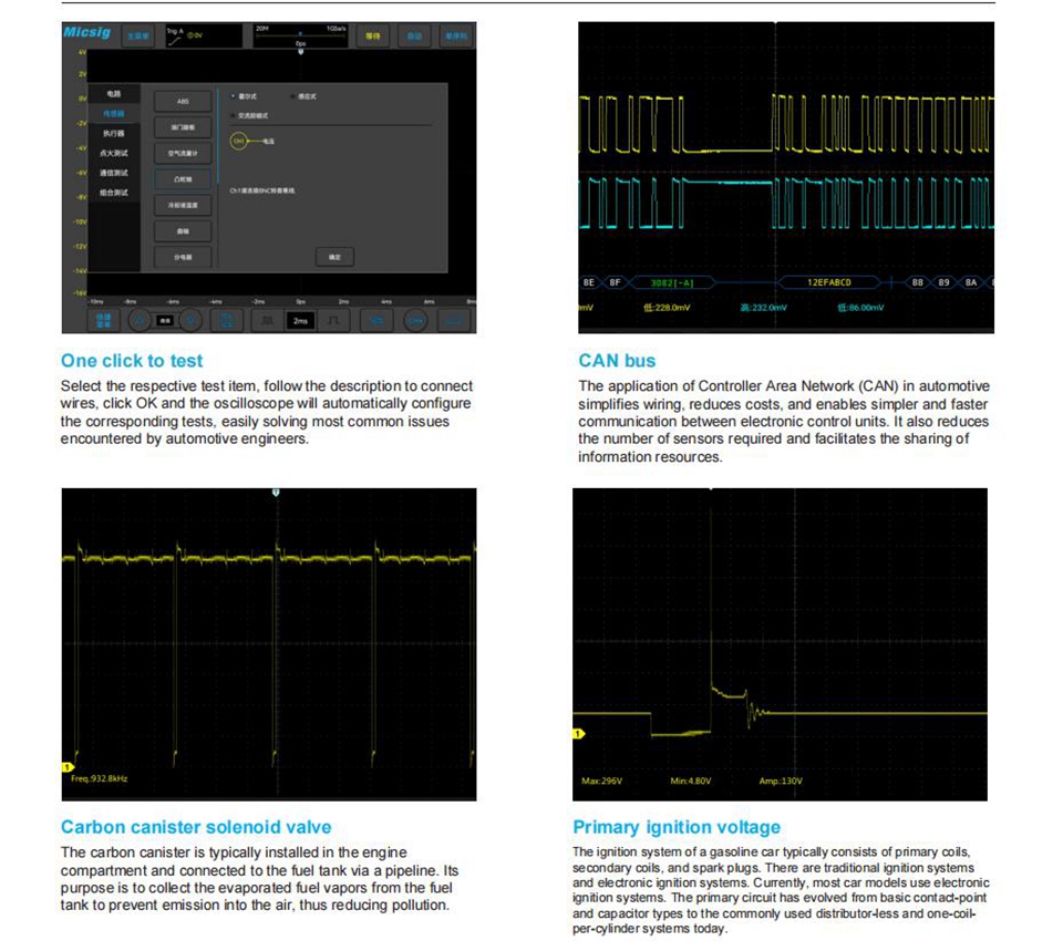 - With a user-friendly UI design, a wide range of measurement options, and built-in professional automotive software packages, it allows for one-click test configuration and provides a new automotive diagnostic operation experience.
