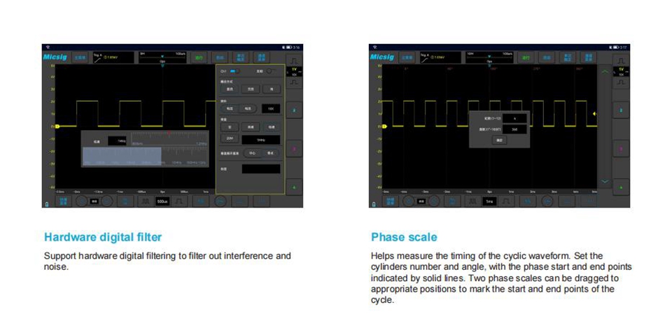 - Automated measurement: 31 types. Including: Period, Frequency, Rise Time, Fall Time, Delay, Positive Duty , Cycle, Negative Duty Cycle, Positive Pulse Width, Negative Pulse Width, Burst Width, Positive Overshoot, Negative Overshoot, Phase, Peak-to-Peak, Amplitude, High, Low, Maximum, Minimum, RMS, Cycle RMS, Mean, Cycle Mean