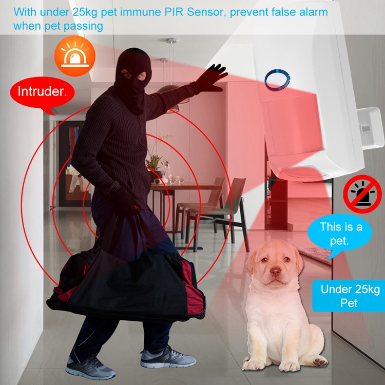 - Friendly to your pet under 25KG. If you are pet owner, we recommend you to use pet friendly PIR motion sensor to immunity your pet. It is because pets can even trigger a false alarm.