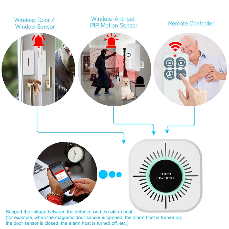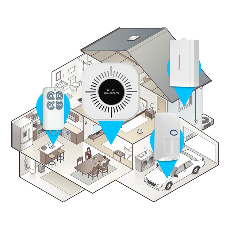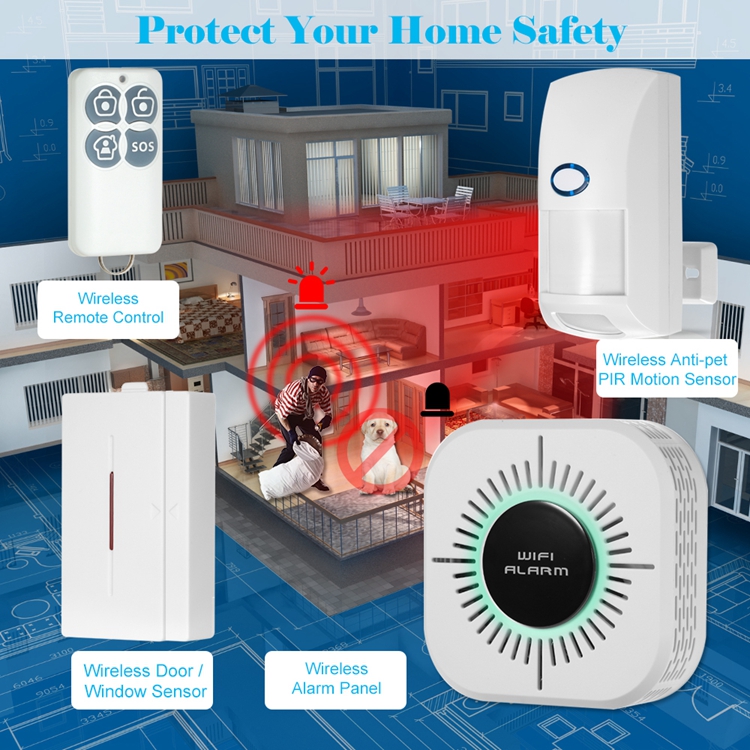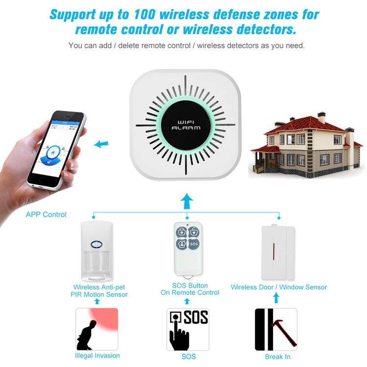 It combines advanced GSM digital signal with WiFi network technology and peripheral sensing detection technology. When the main unit is in arming status and the owner is absent, as long as there are intruders, the peripheral sensing detector will immediately send a wireless signal to it which will report the event log to your mobile phone APP. It keeps your property well protected.