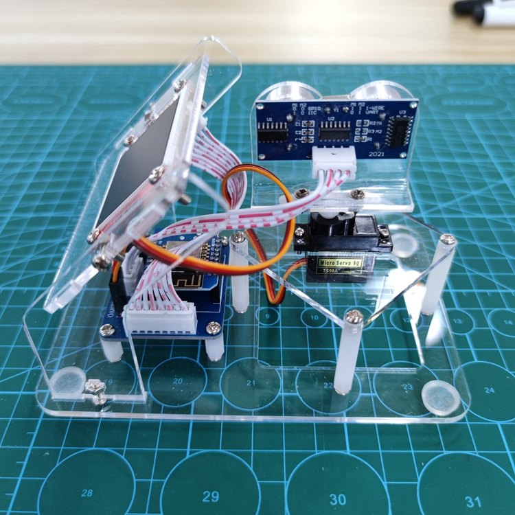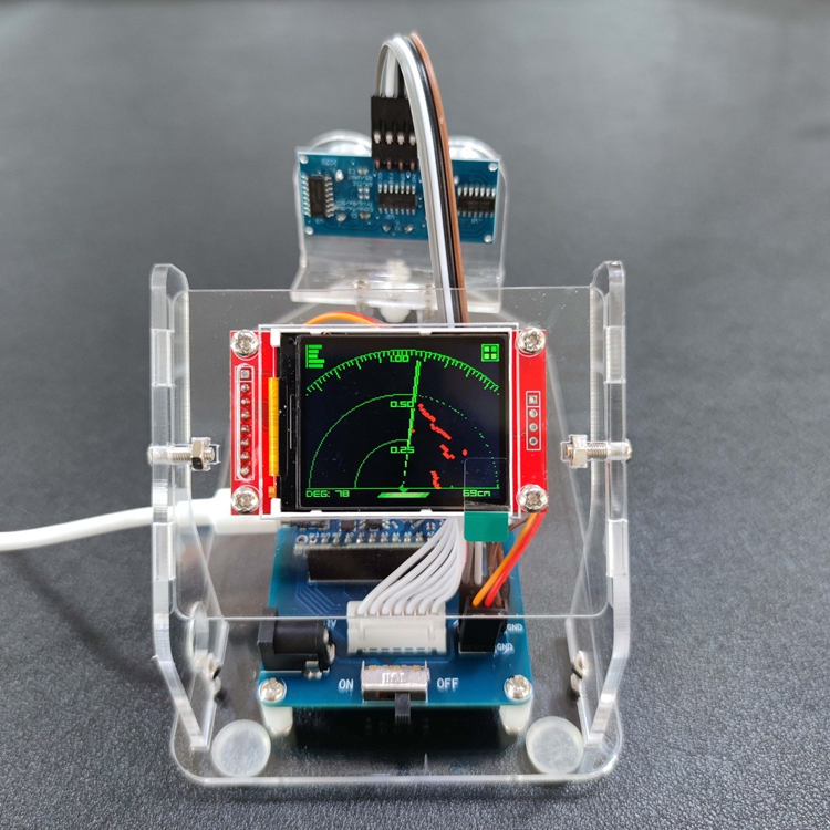 - It is a mini ultrasonic radar that functions like the radar on the movie. It can scan a small range of targets and display them on the screen (the sector area displays the targets within 1 meter in the form of red dots, and the lower right corner of the screen displays the targets within 4.5 meters in the form of numbers).