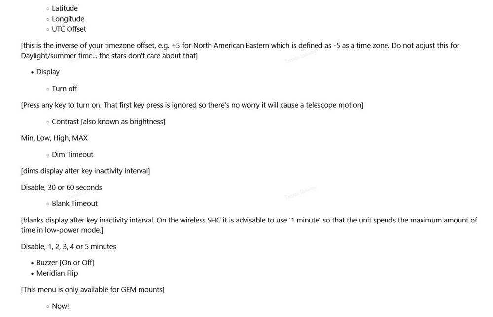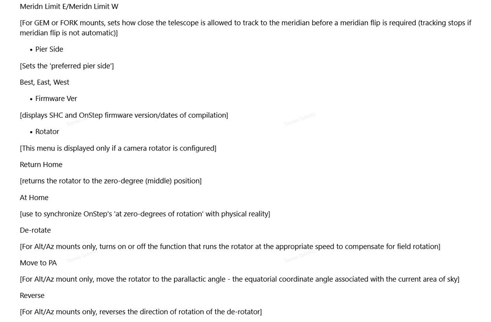 - N/S button: controls the rotation of the equatorial declination axis. When N is pressed, declination will always move towards the north celestial pole. This button is the page up button in the menu.