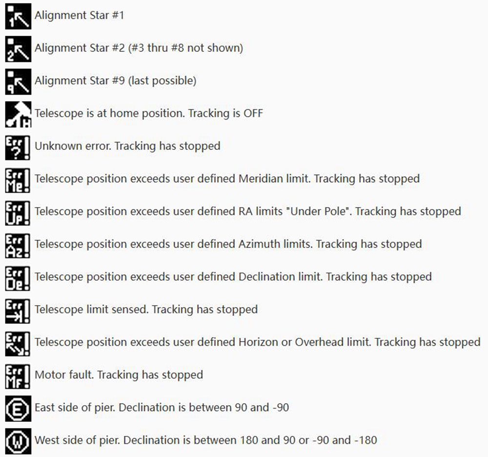 - E/W button: controls the rotation of the equatorial right ascension axis. In the menu, W is the confirm button and E is the return button.