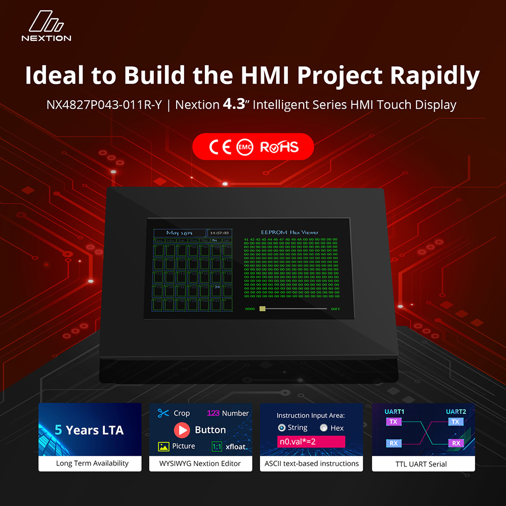 Nextion Editor is a free human-machine interface (HMI) GUI development software for Nextion Basic Series, Enhanced Series, and Intelligent Series. The software offers an easy way to create an intuitive and superb touch user interface even for beginners. Add a static picture as a background, define functions by components, you can make a simple GUI in minutes. The easy Drag-and-Drop components and simple ASCII text-based instructions will dramatically reduce your HMI project development workloads and develop projects rapidly in a cost-effective way. The Nextion product is the best balance HMI solution between cost and benefit with a low and decreased learning curve.