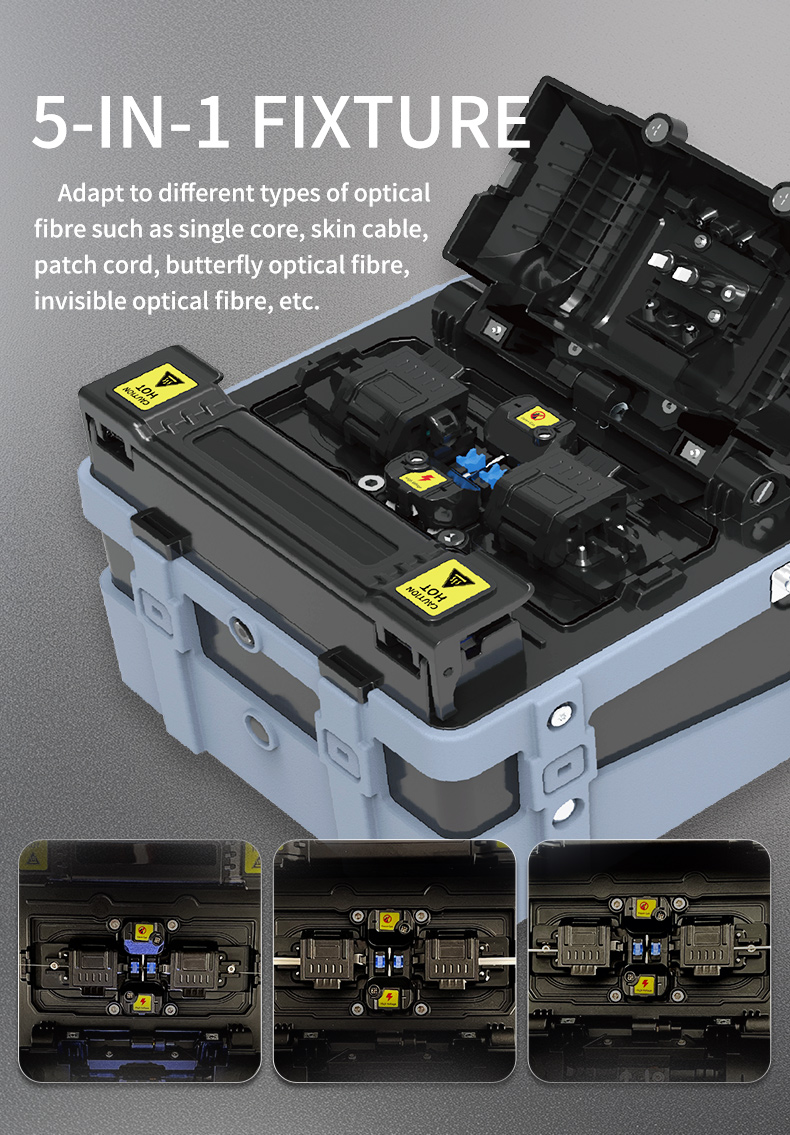- Three-in-one clamp: Suitable for different types of optical fibers such as single core, leather cable, patch cord, butterfly optical fiber, invisible optical fiber, etc.