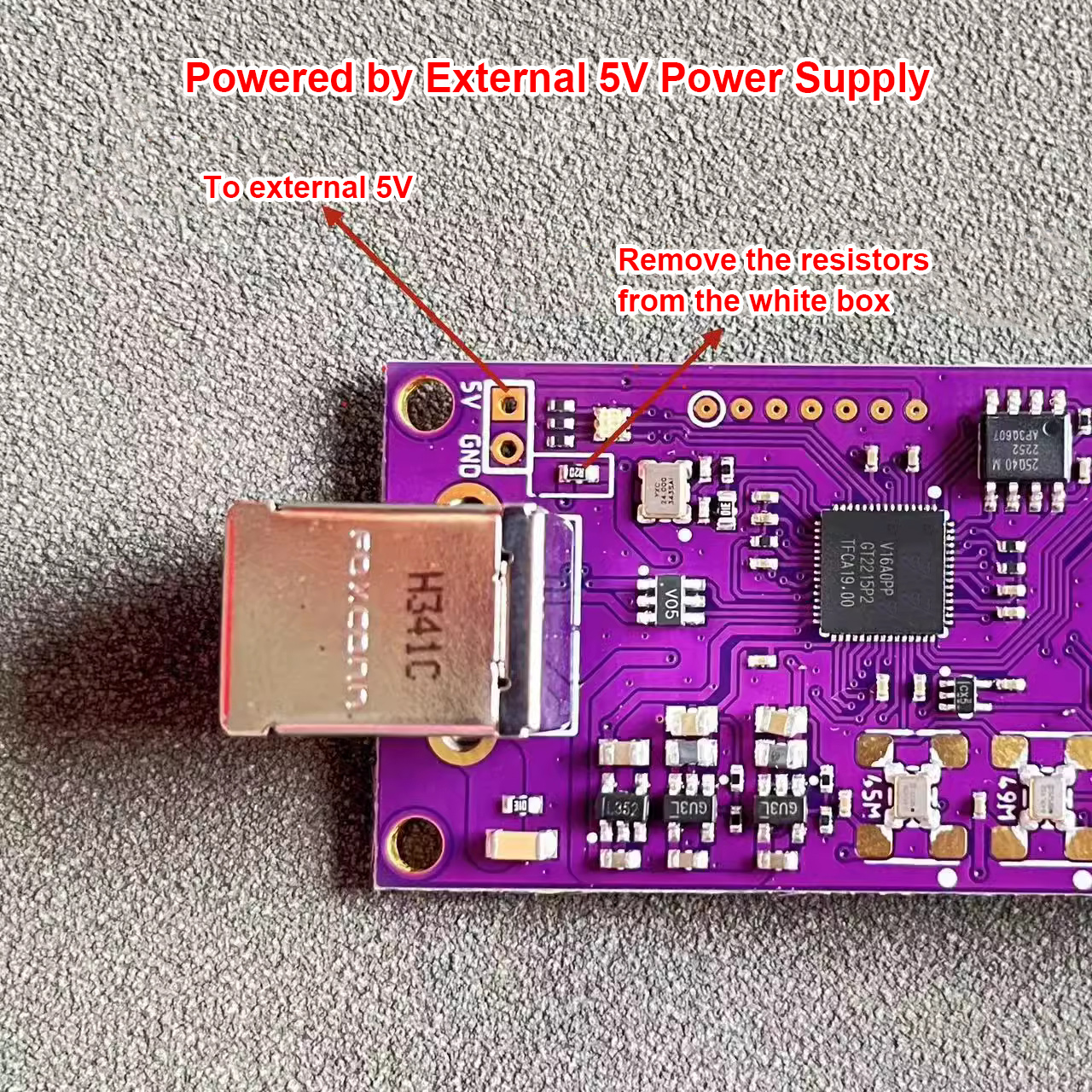 - Can be powered via its USB port. It can also be powered by an external 5V power supply (the method is shown in the picture below)