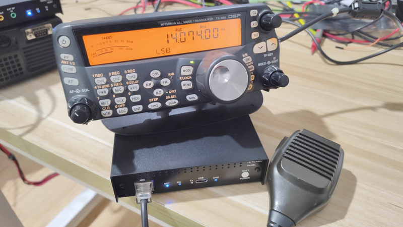 Through the boxes, you can put the main unit of TS-480 in one place, put the panel and handheld mic in another place, and realize remote SSB call and reception, frequency adjustment, buttoning, power on/off, CW and other operations through the network.