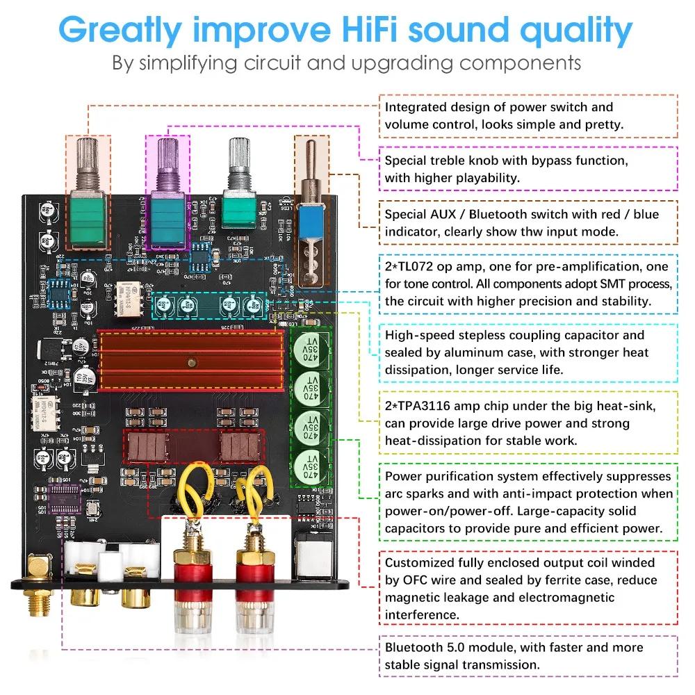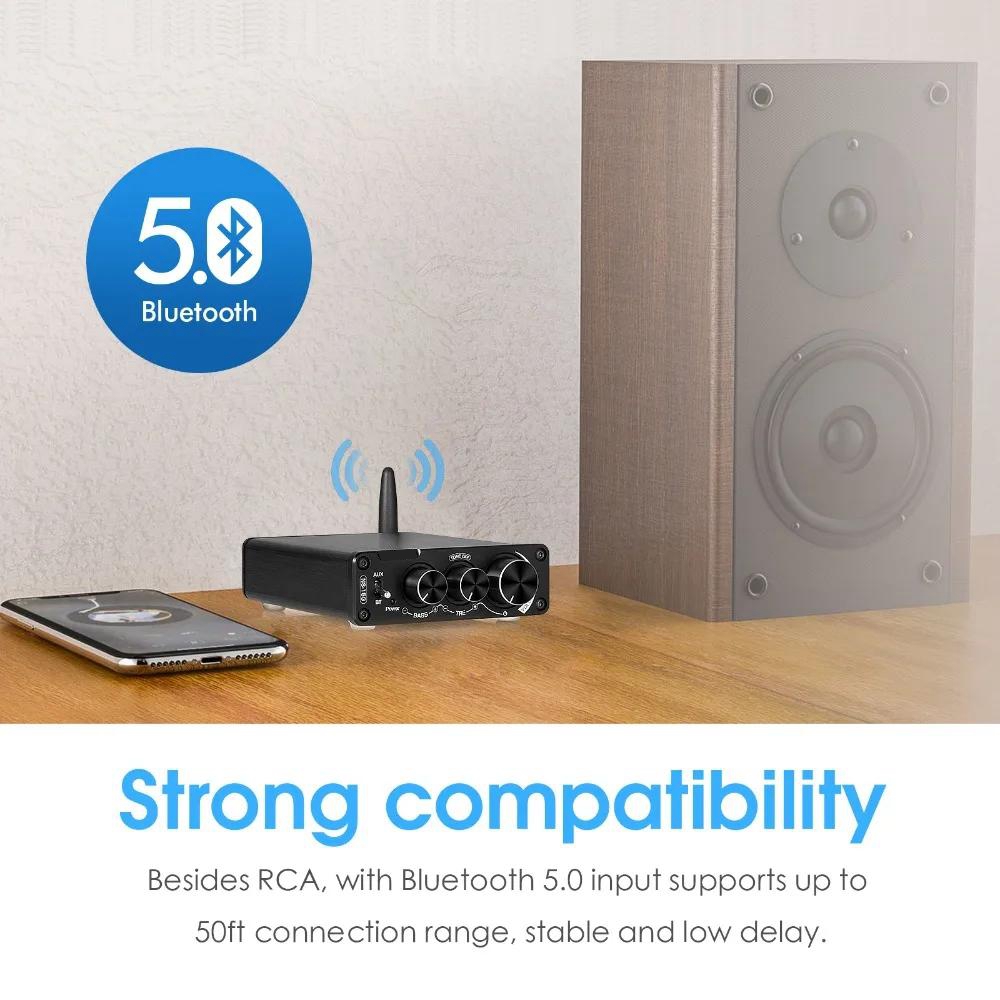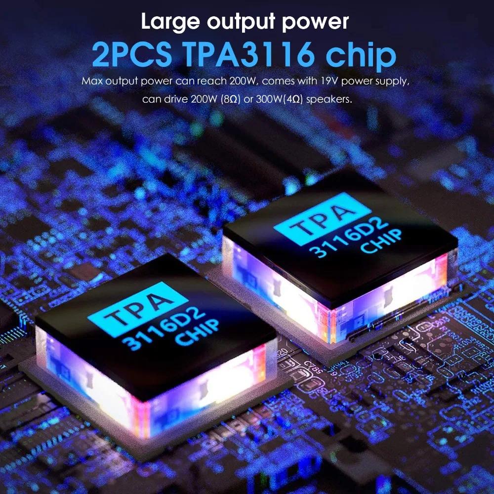 - Strong compatibility and large output power: besides RCA, with Bluetooth 5.0 input supports up to 50ft connection range, stable and low delay. 2PCS TPA3116 chip, max output power can reach 200W, comes with 19V power supply, can drive 200W (8Ω) or 300W (4Ω) speakers.