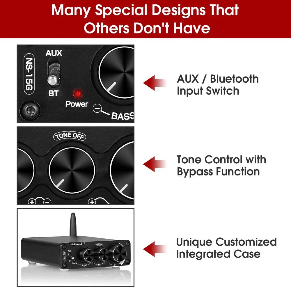 - Unique design in appearance and technology: AUX / Bluetooth switch with red / blue indicator; pure integrated aluminum case and knob with multi-process fine treatment, CNC precision cutting ; curved smooth edges highlights its unibody design; metal DC outlet, no electric sparks flying.