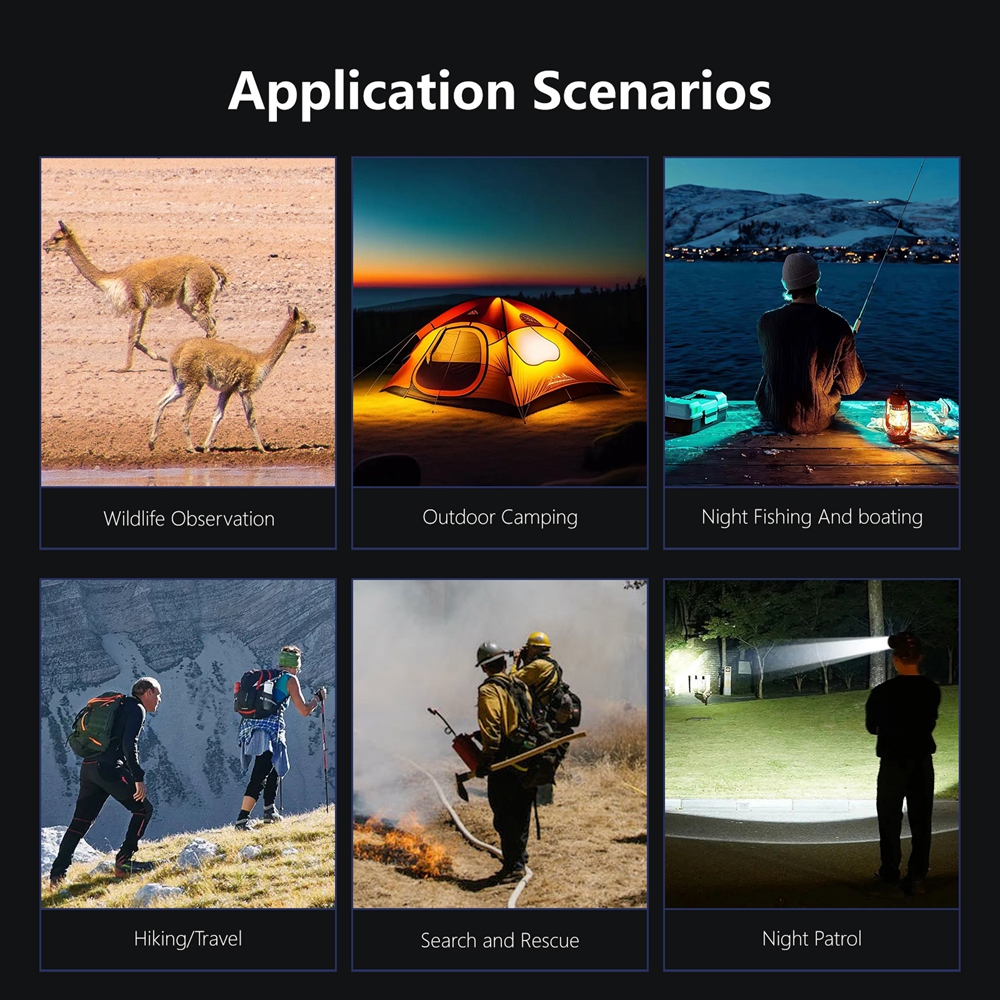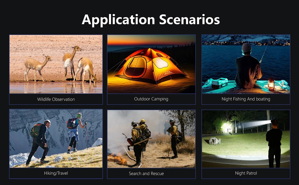 - Tactics, reconnaissance, hunting, security and surveillance, camping fun, cave exploration, night fishing and boating, wildlife observation and photography, etc.