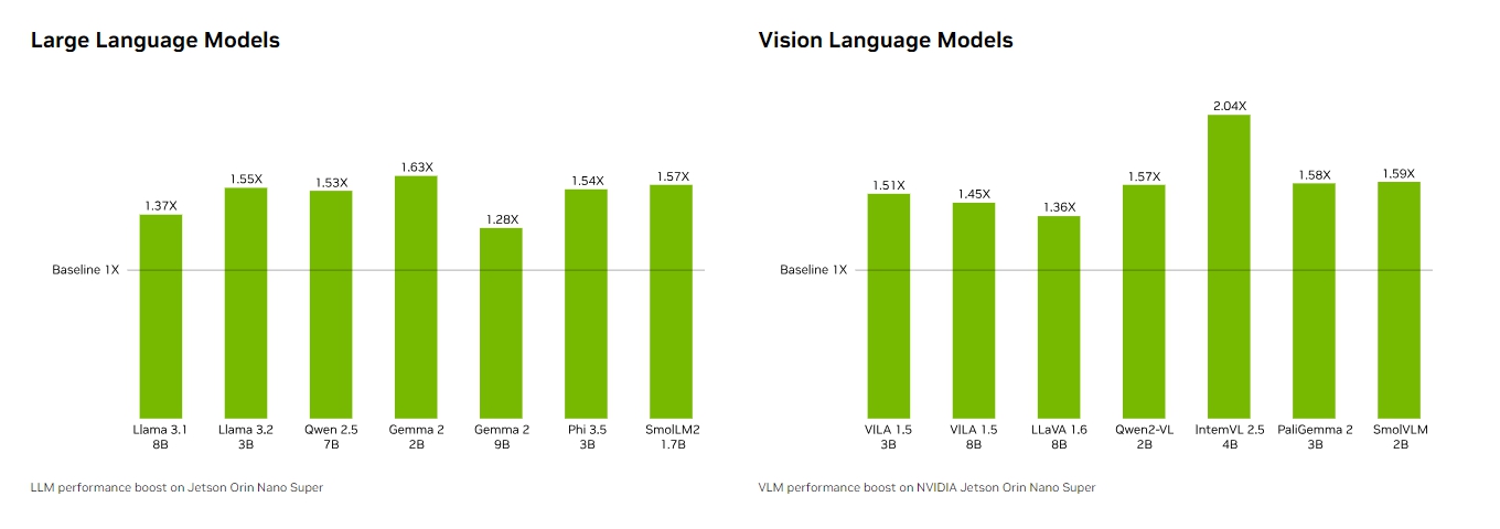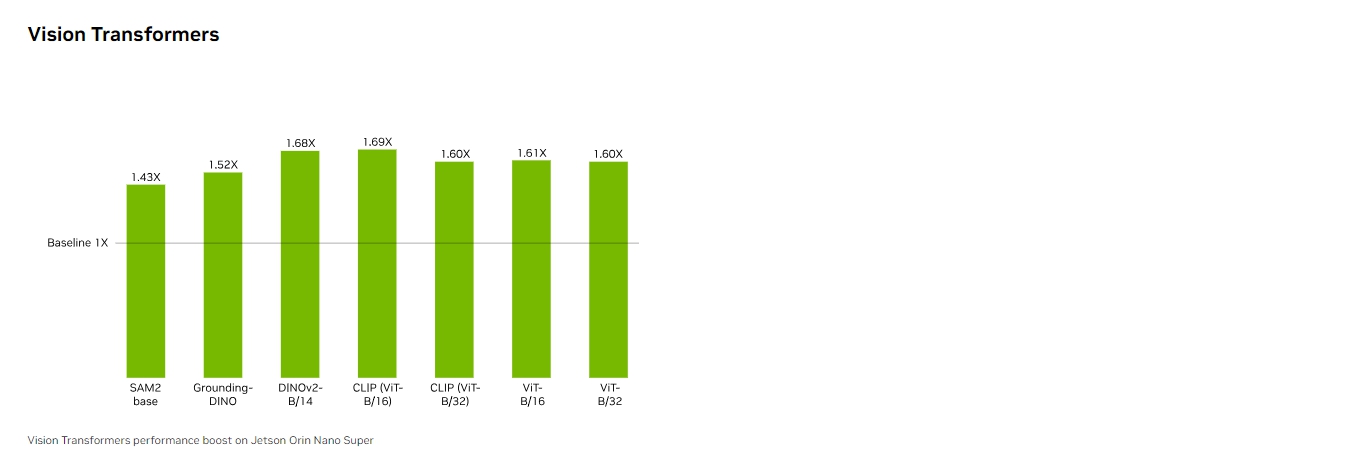 * The NVIDIA Jetson Orin Nano Super delivers significant performance increases over its predecessor on a wide variety of popular Large Language Models (LLMs), Vision Language Models (VLMs), and Vision Transformers.