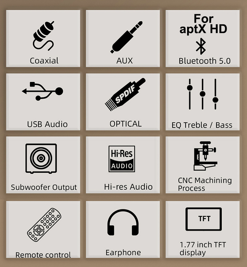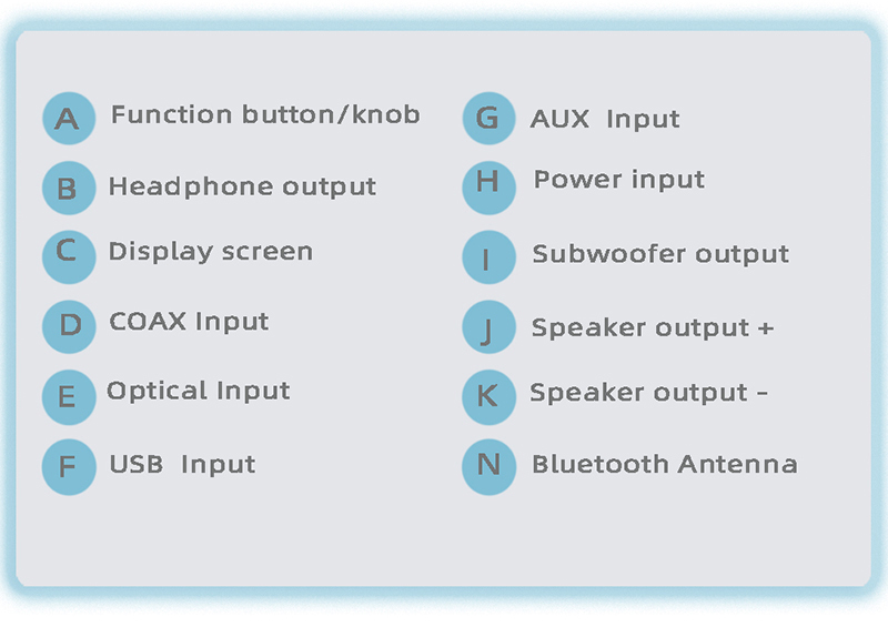 - Input: Bluetooth, USB, RCA, Optical, Coaxial and AUX