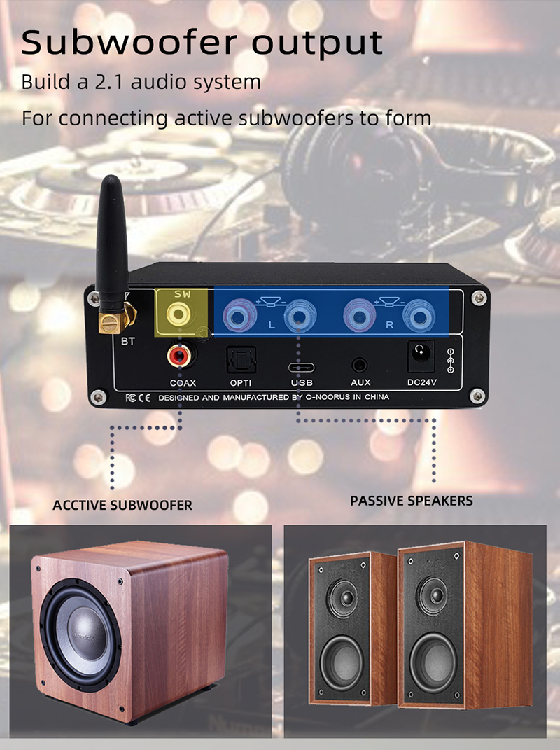 - Output: passive speaker, subwoofer and active speaker