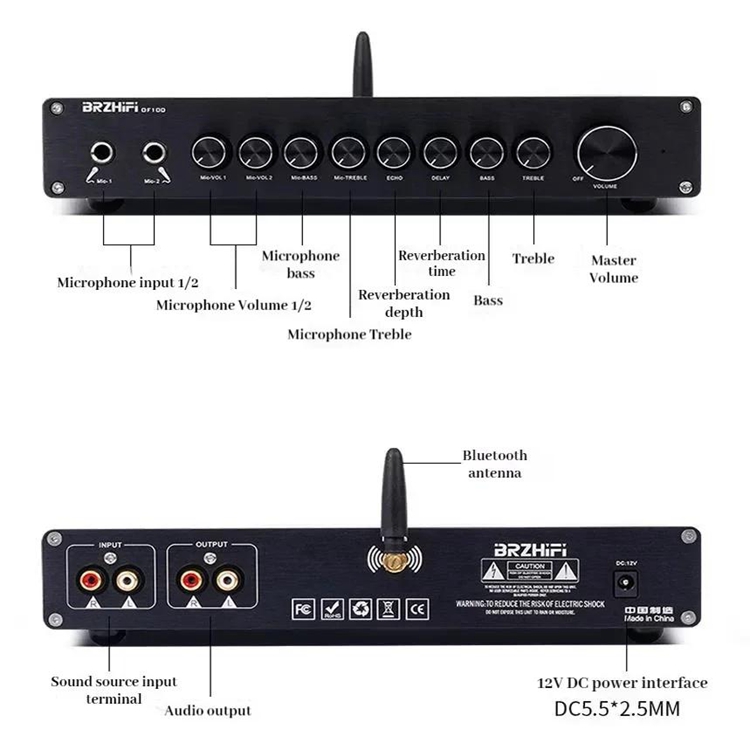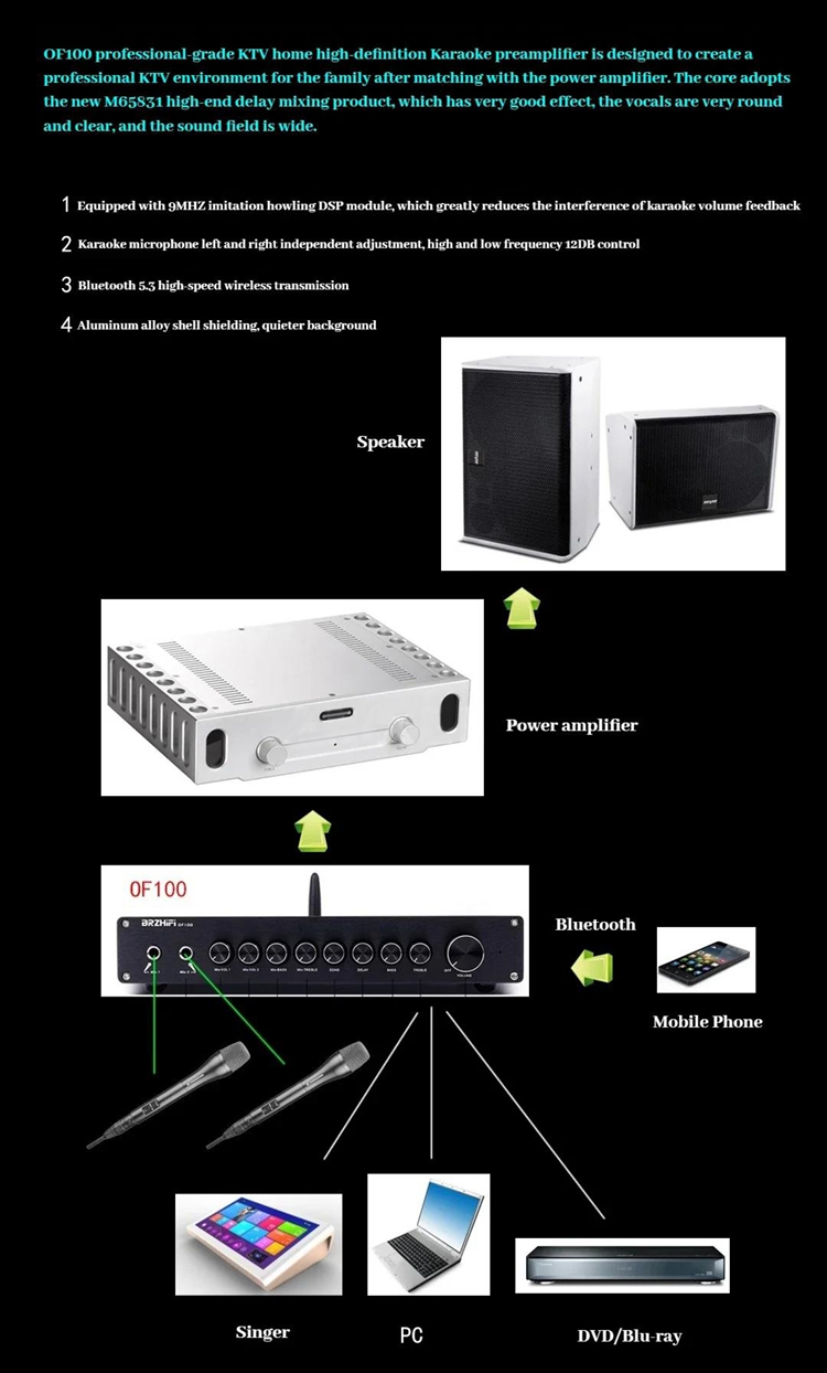 OF100 300W+300W Professional Karaoke Power Amplifier HiFi Audio Preamplifier M65831 Mixing with 12V Power Adapter
