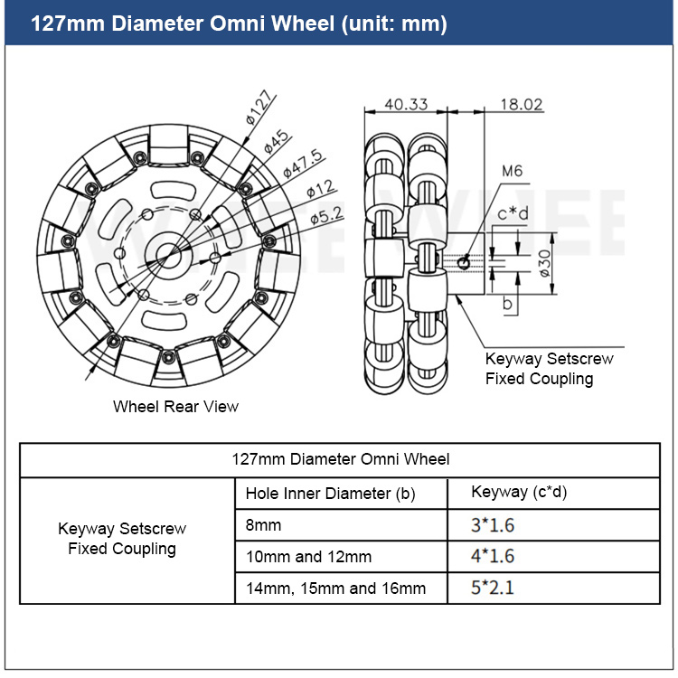 Omni A127 Omni Wheel Driving Wheel (127mm Diameter w/ Keyway Setscrew Fixed Coupling for 40KG Load)