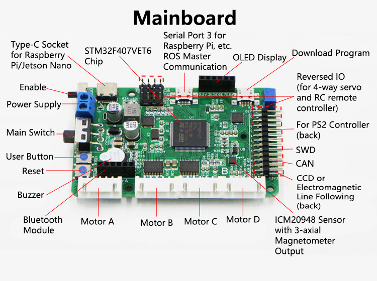The board is developed and designed for smart cars and ROS. One board can control a variety of current mainstream robot chassis using Ackerman, differential, Mecanum wheel, omnidirectional wheel, track, etc., providing corresponding codes. The main board can communicate with the outside world through serial port or CAN, and provides a 5V 5A interface to supply power to boards such as for Raspberry Pi or Jetson nano. Full open source code and protocol are provided.