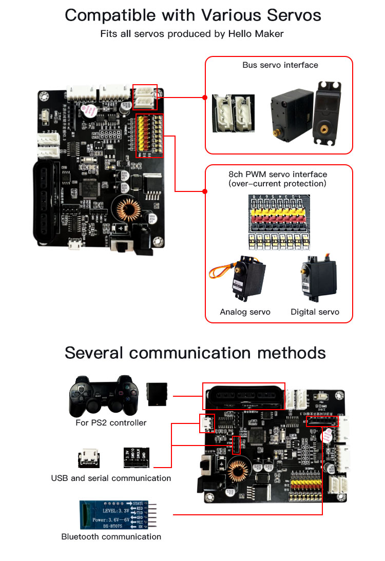 - Can be used to control 2ch motor, 8ch PWM servos, and serial bus servos