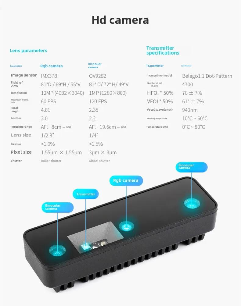 - Maximum frame rate: 60fps (RGB camera), 200fps (depth camera)