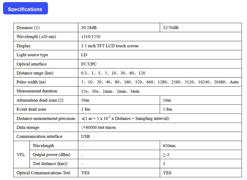 2. Dead zone measurement conditions: The reflection event occurs within 4KM. The reflection strength is smaller than -45dB. The minimum pulse width is used.